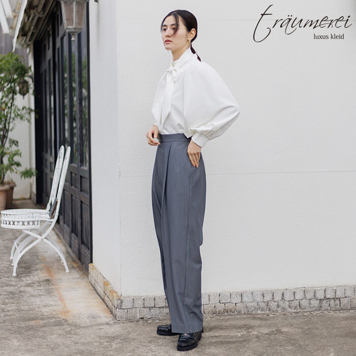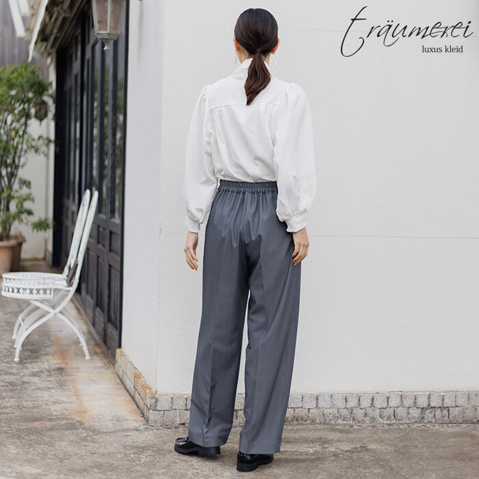 入学式や卒業式などのセレモニーはもちろん、オフィスやお出かけにも活躍する万能ワイドパンツ。ゆるやかなラインが身体のラインを拾いにくく、太もも周りをさりげなくカバー。お腹まわりには程よいゆとりを持たせつつ、ややテーパード気味のシルエットが脚をすらりと見せてくれます。ウエストはフィット感のある後ろゴム仕様で、長時間はいても快適な着心地。センタープレスを施すことで、全体をきちんとした印象に仕上げました。