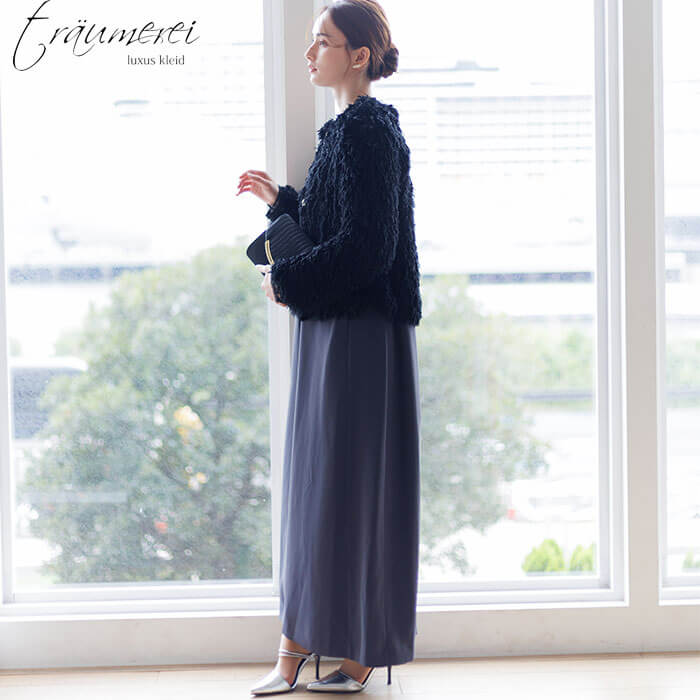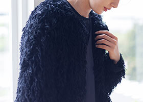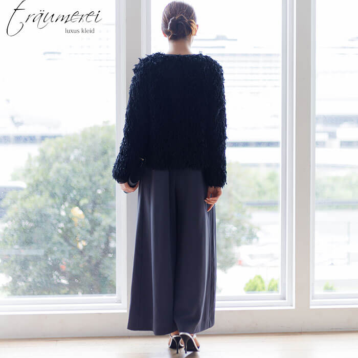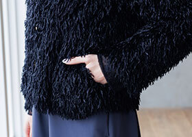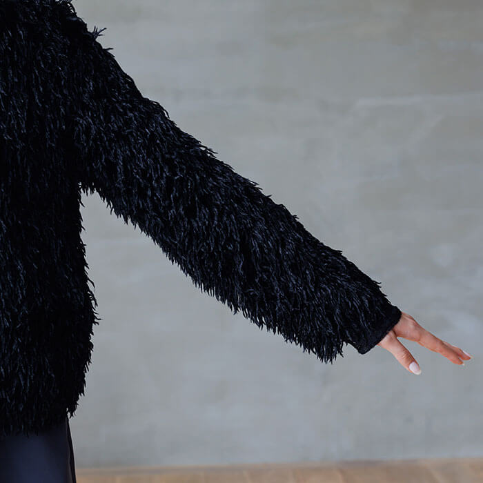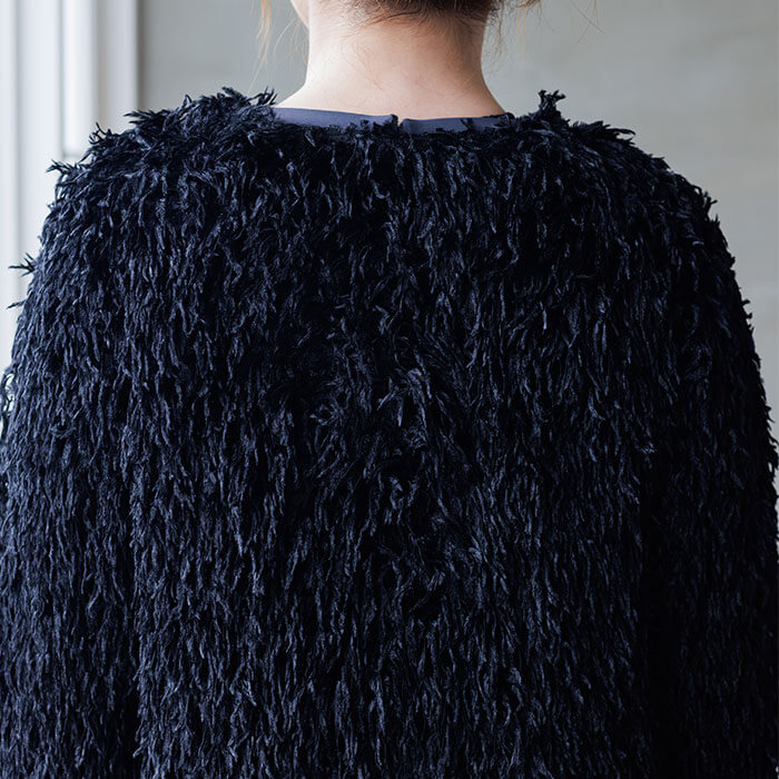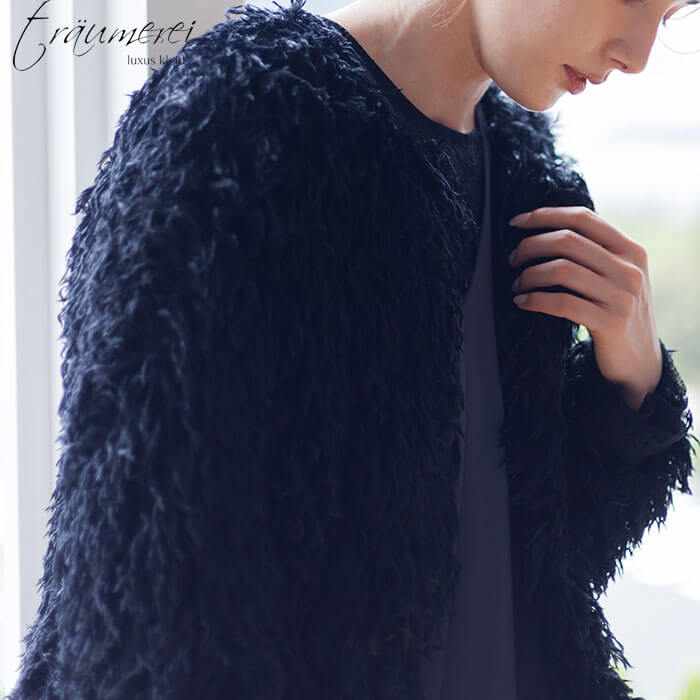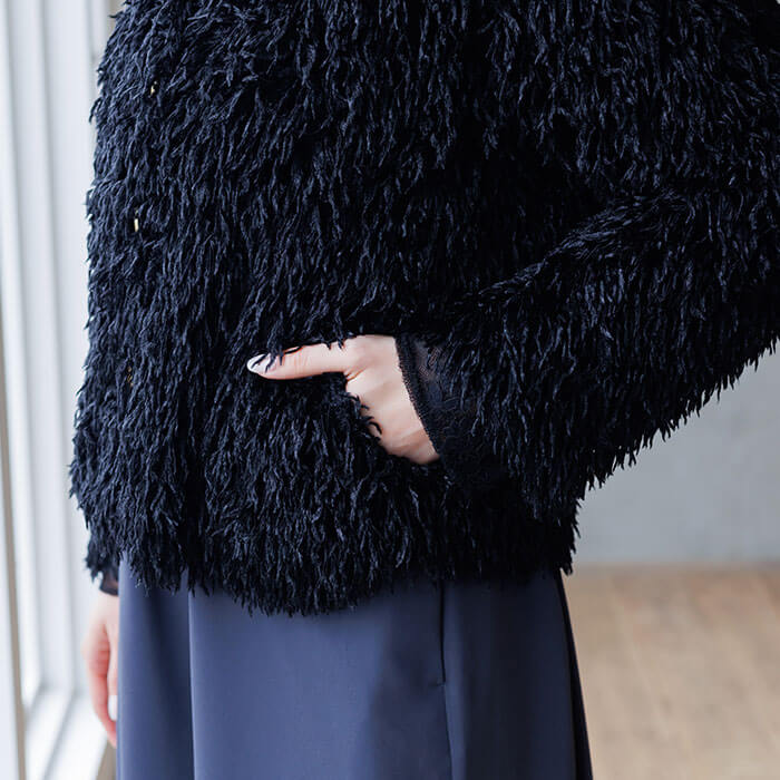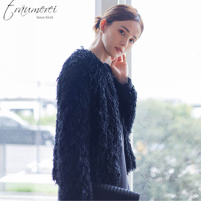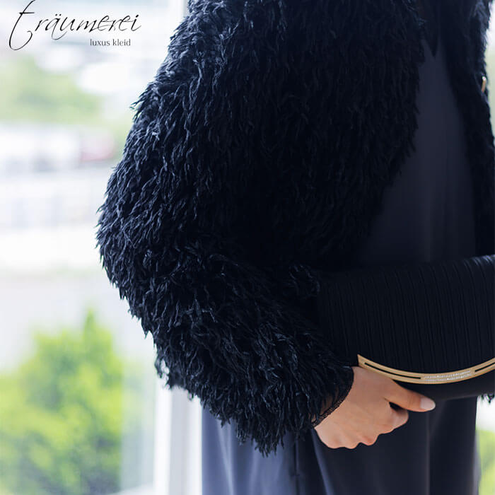 毛並みが美しいフェザーニットファンシーを使用、華やかで品のある雰囲気を引き立てます。