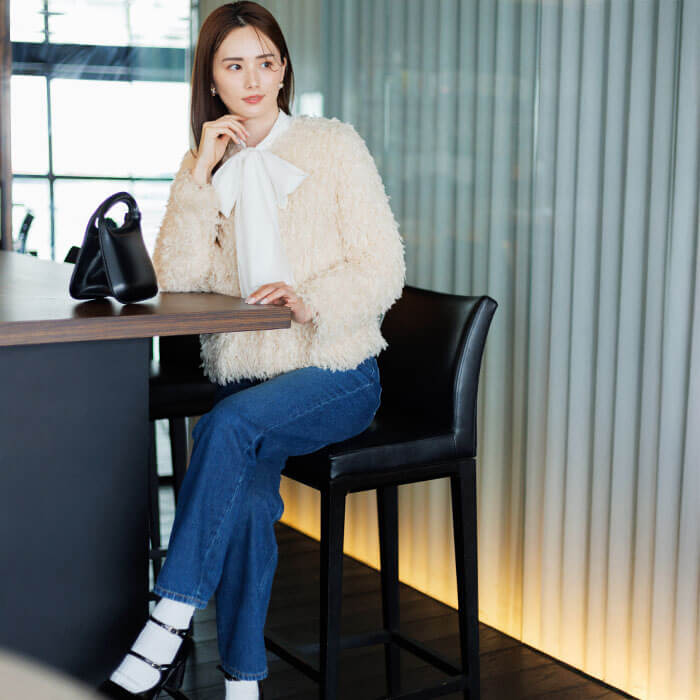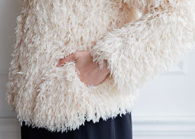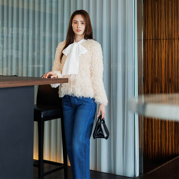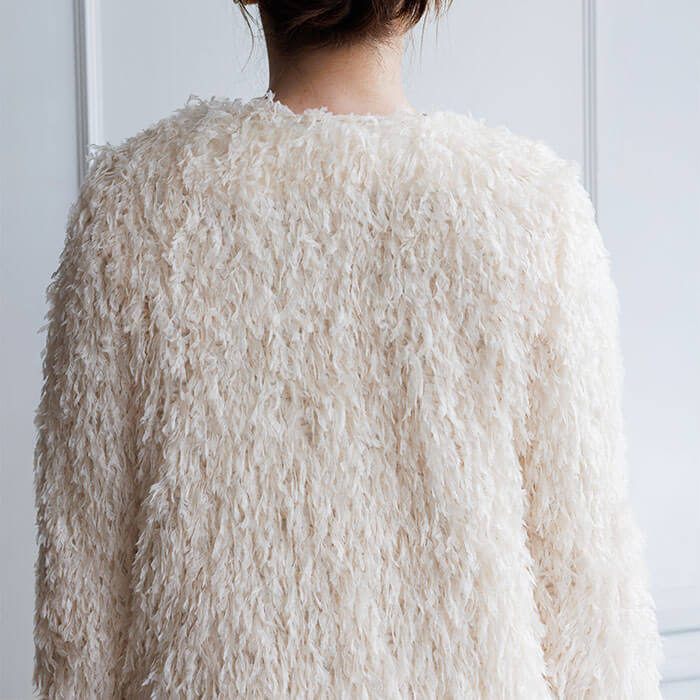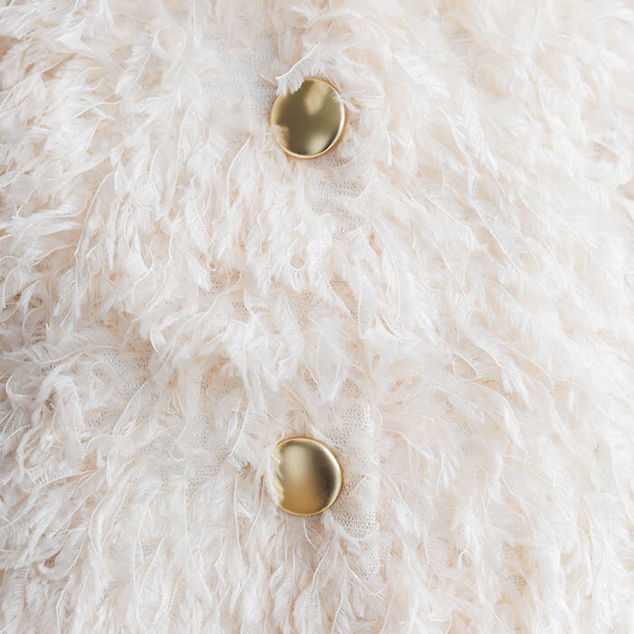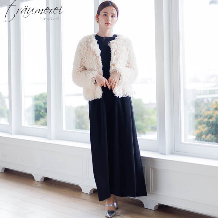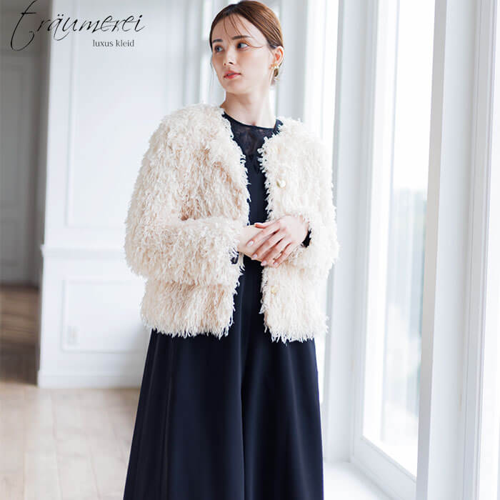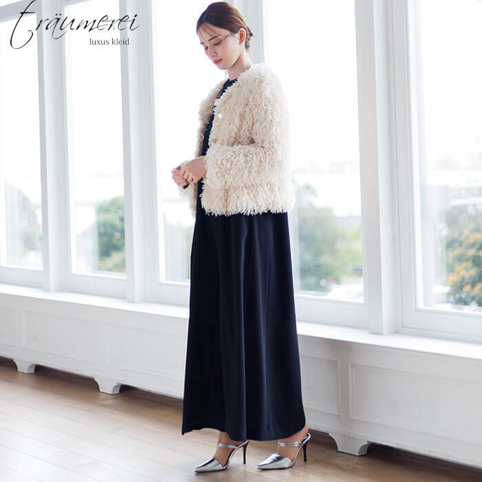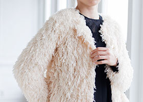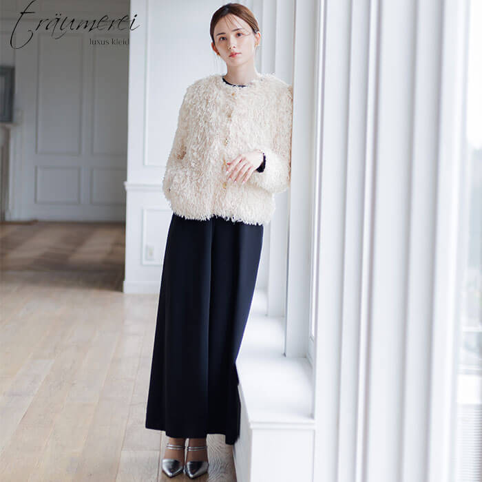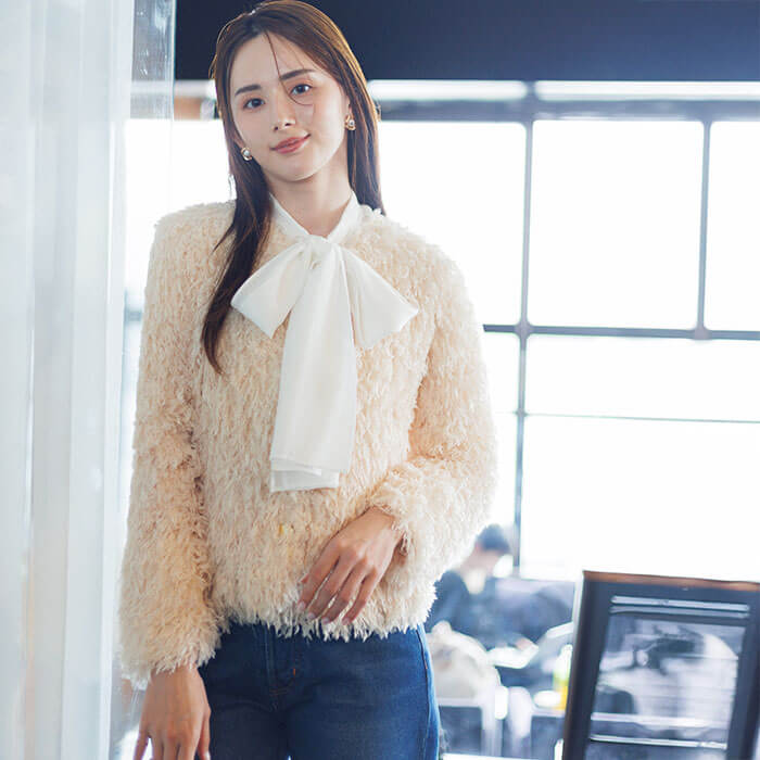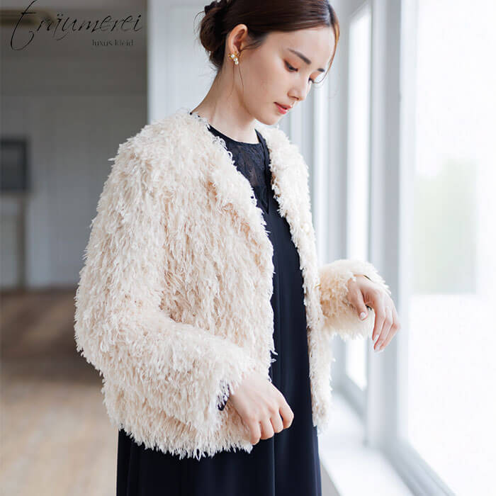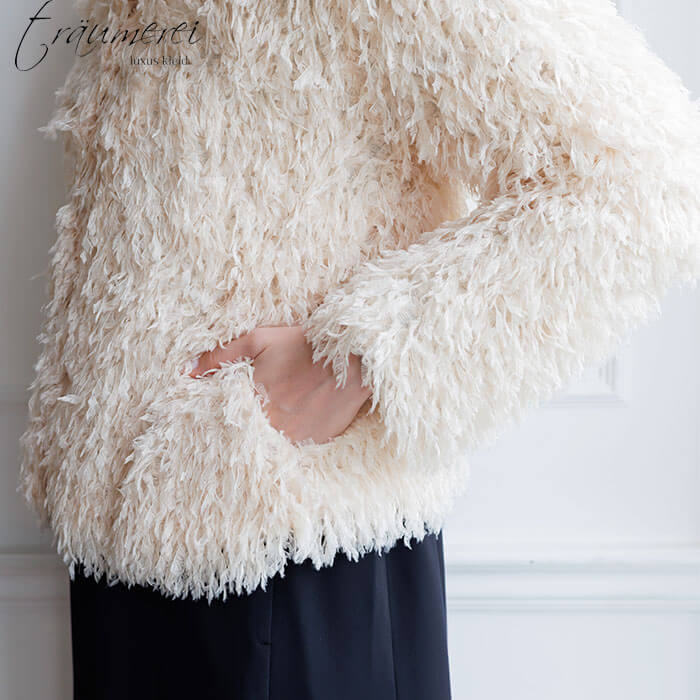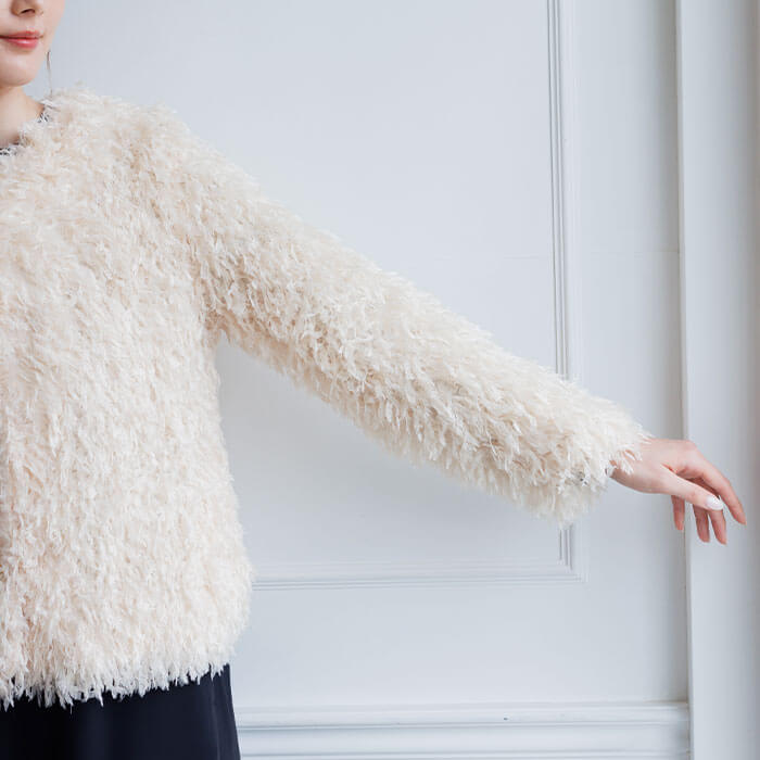 毛並みが美しいフェザーニットファンシーを使用、華やかで品のある雰囲気を引き立てます。