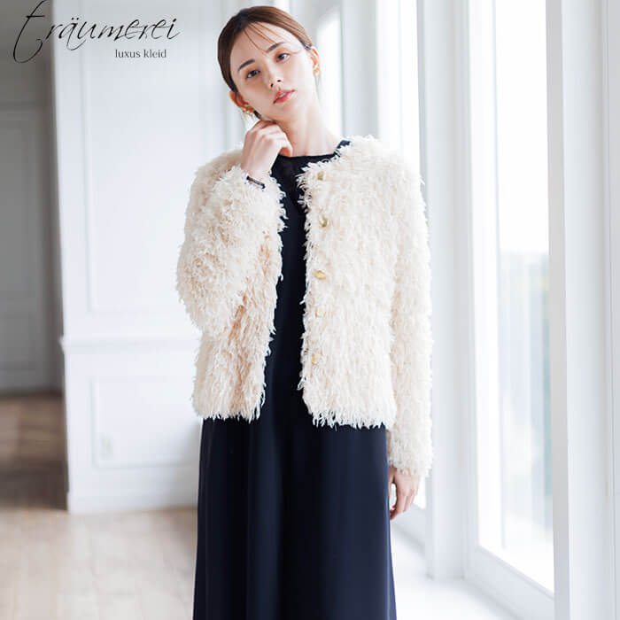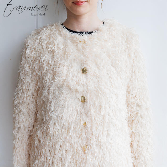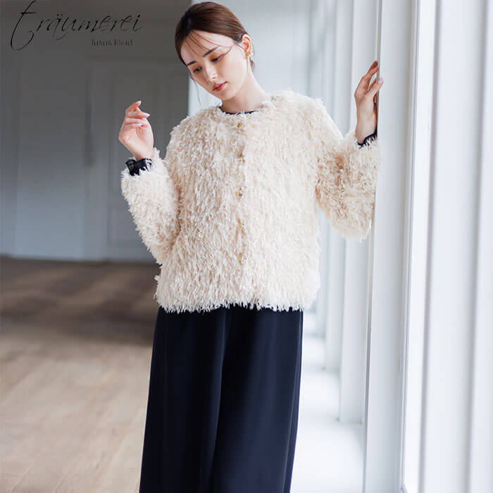 今日の私を、少しだけ特別に。「トロイメレイ」から、オケージョンからデイリーまで幅広く活躍するフェザーニットジャケットが登場。つやっとした金ボタンが上品なアクセントとなったショート丈デザインで、羽織るだけで華やかな装いが完成します。毛足の長めなフェザーは、思わず触れたくなるふわふわな手触り。女性らしい優雅な印象を与えます。