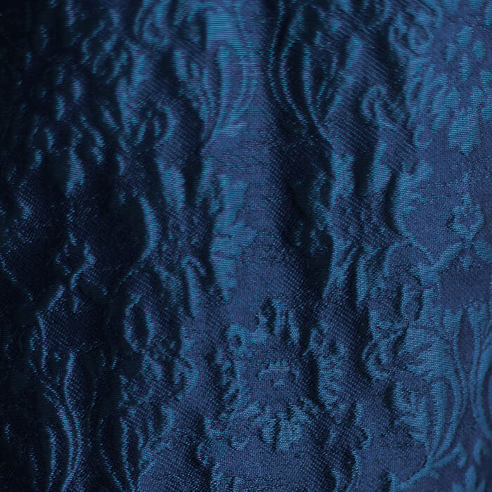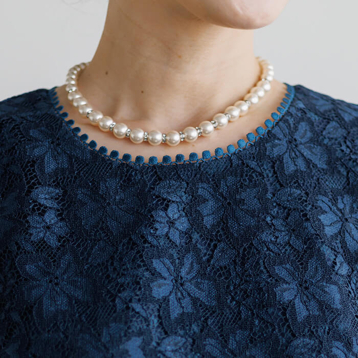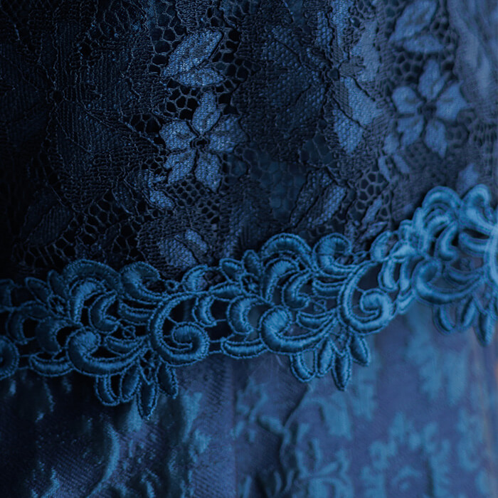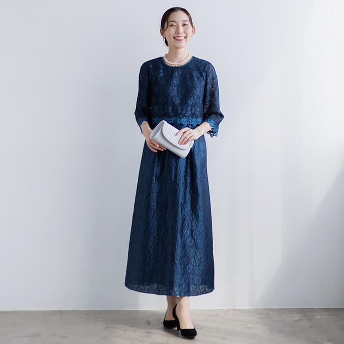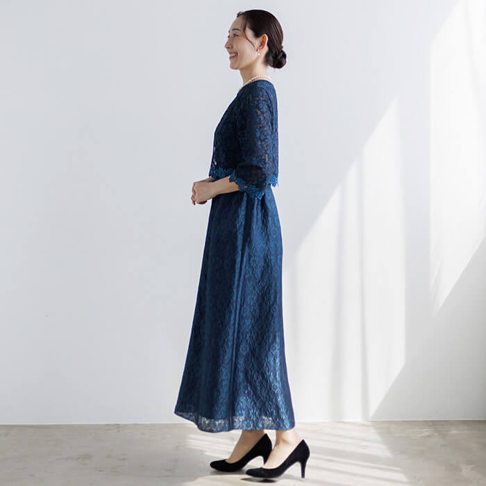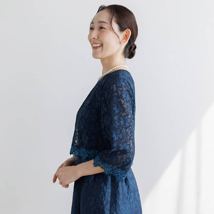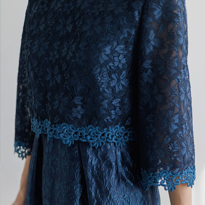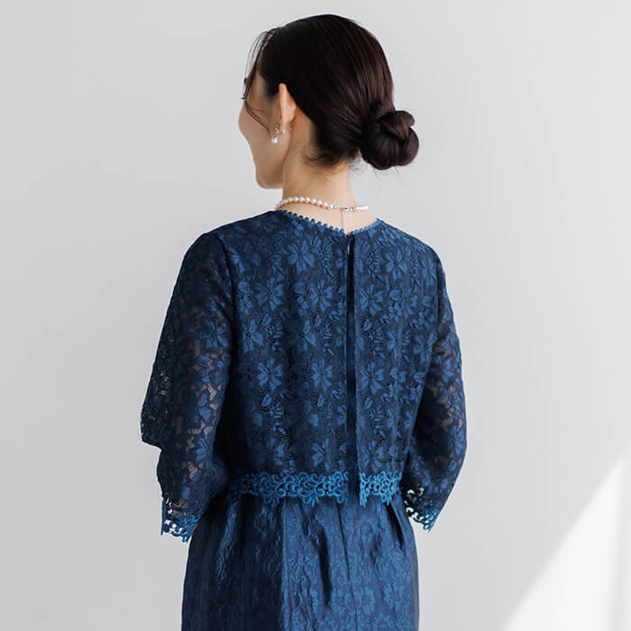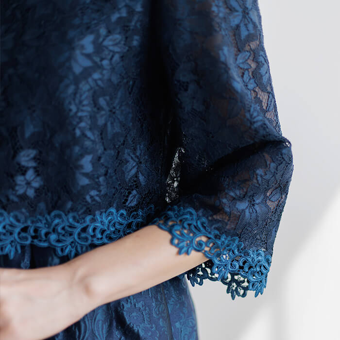 季節を問わない七分丈の袖に、動きやすくシンプルなフレアーラインのシルエット。フラワーモチーフをあしらった繊細なレースと、立体的に柄を織り上げた光沢感のあるフクレジャカードのコンビネーションが優美で凛とした存在感を放っています。