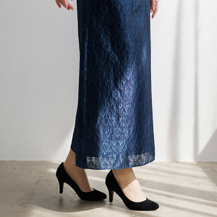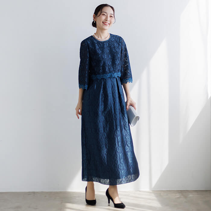 フクレジャカードとレースのブラウスが一体となったロングドレス。ジャケットを羽織らずとも、1着で結婚式のお母様にふさわしい装いが完成します。