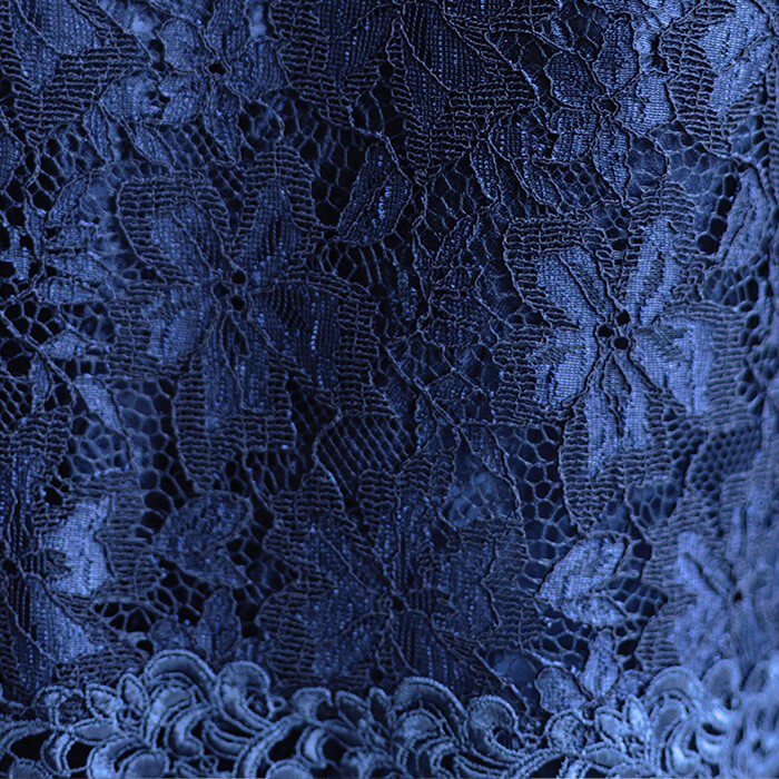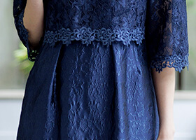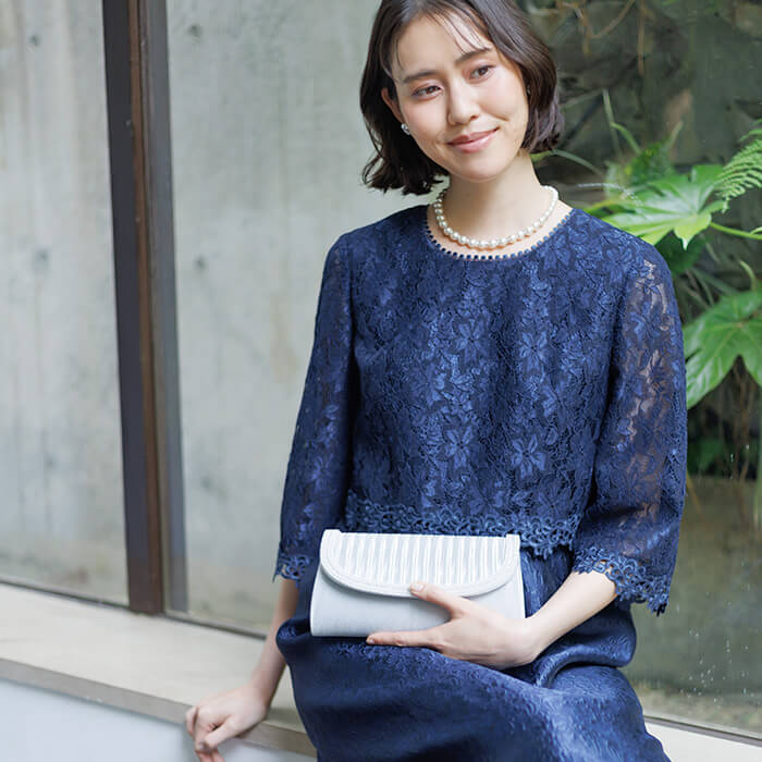 季節を問わない七分丈の袖に、動きやすくシンプルなフレアーラインのシルエット。フラワーモチーフをあしらった繊細なレースと、立体的に柄を織り上げた光沢感のあるフクレジャカードのコンビネーションが優美で凛とした存在感を放っています。