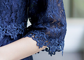 ひじが隠れる長さのレースの袖は、ほんのり上品な透け感です。