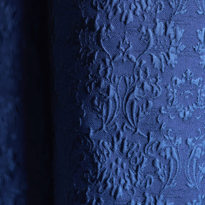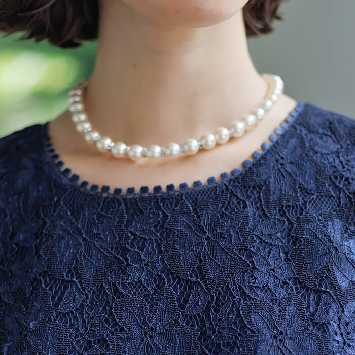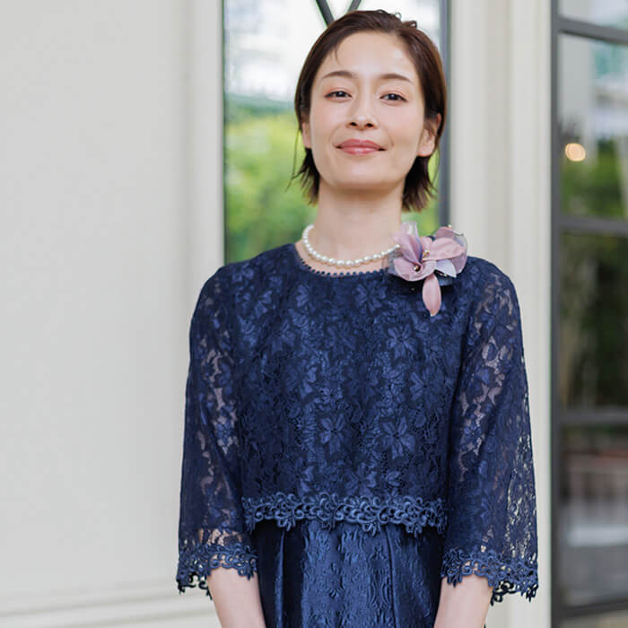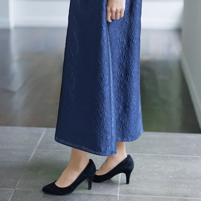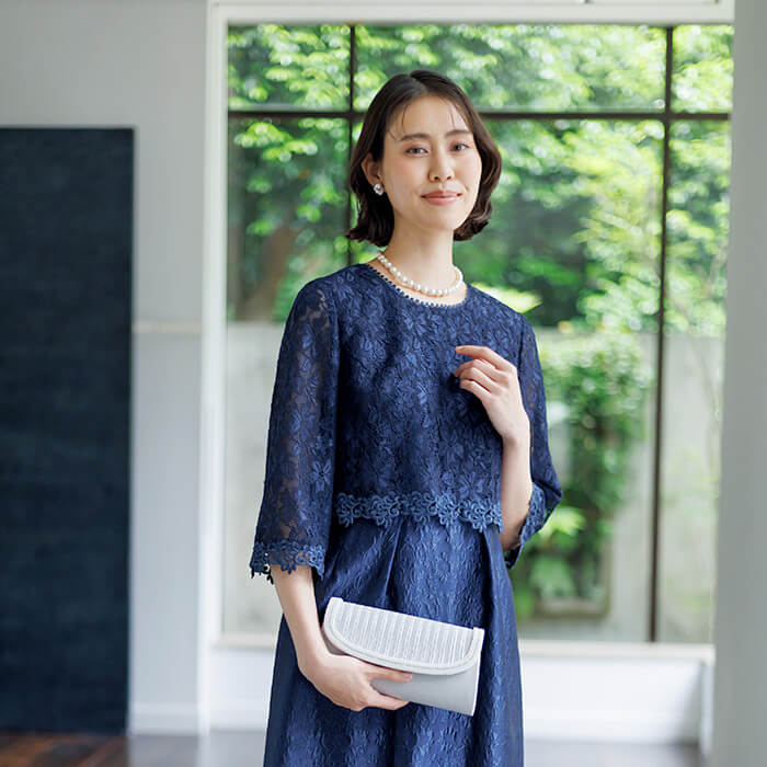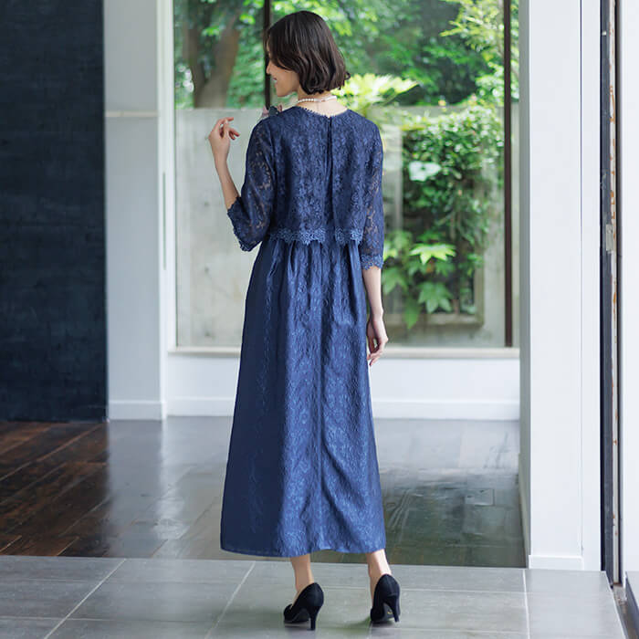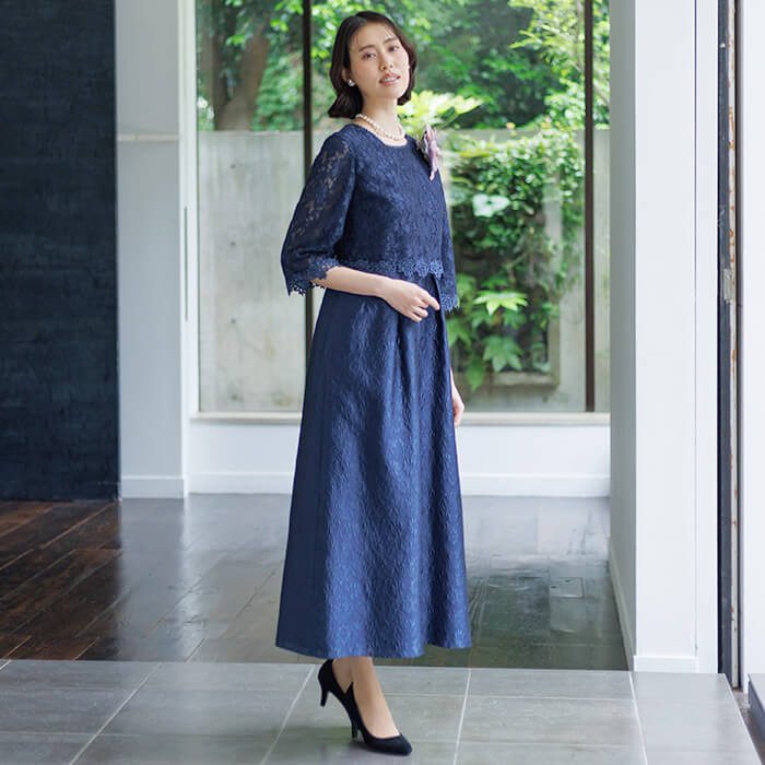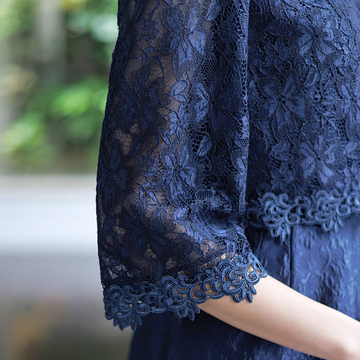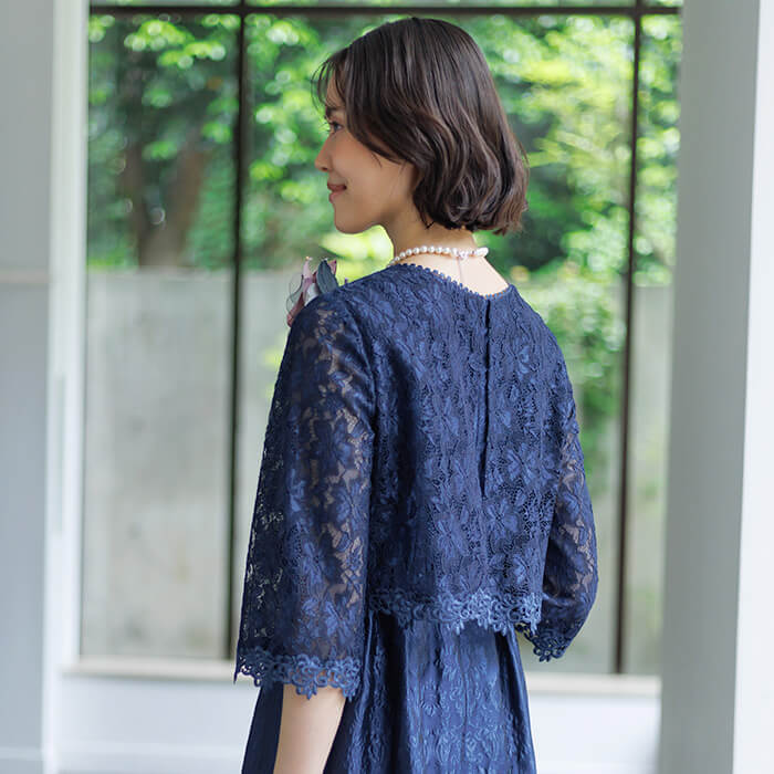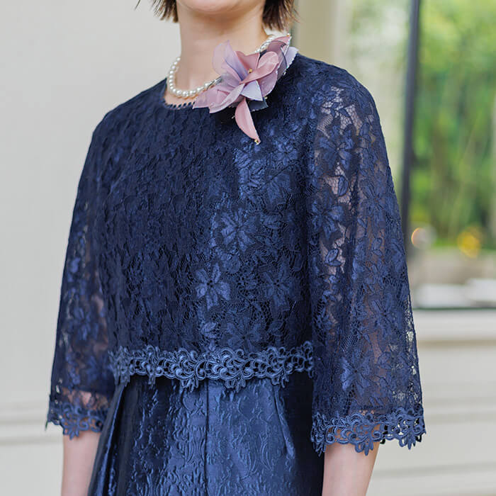 季節を問わない七分丈の袖に、動きやすくシンプルなフレアーラインのシルエット。フラワーモチーフをあしらった繊細なレースと、立体的に柄を織り上げた光沢感のあるフクレジャカードのコンビネーションが優美で凛とした存在感を放っています。