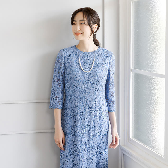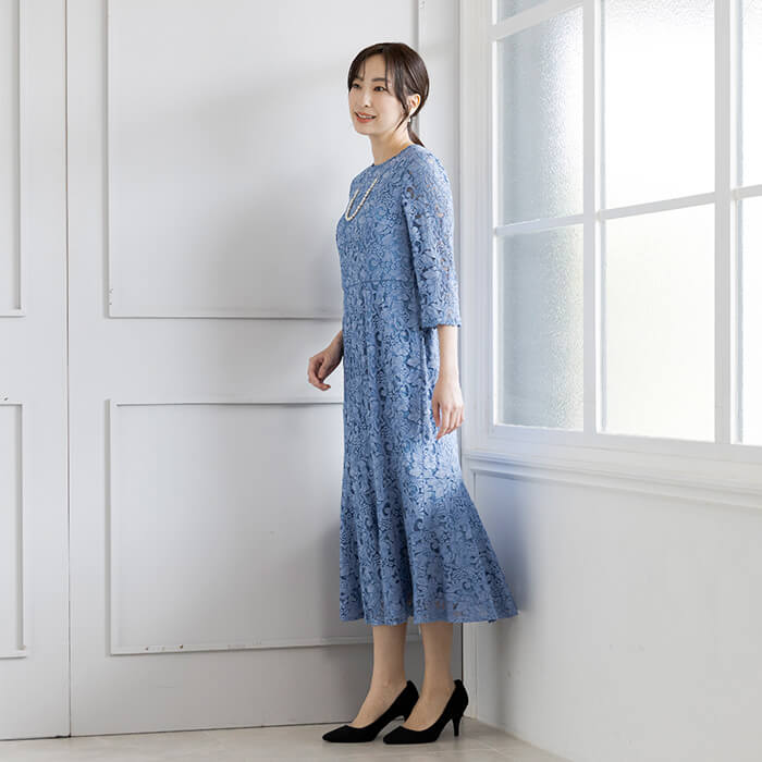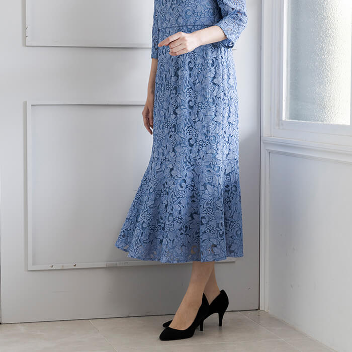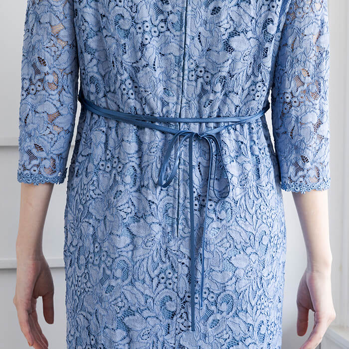 華やかな総レースが目を惹くエレガントで高級感のある一着。上品な透け感のある袖と、ソフトマーメイドシルエットがポイント。裾にかけて程よく広がるフレアが動く度に揺れ優美な印象を与えます。 取り外しできるリボンベルトで、コーディネートをアレンジできます。レースが主役のシンプルなデザインで、年代を問わず着こなせる1着です。結婚式やパーティーなど、特別な日を上品に彩ります。