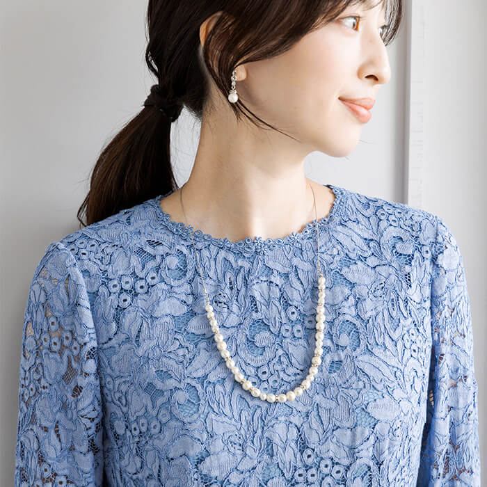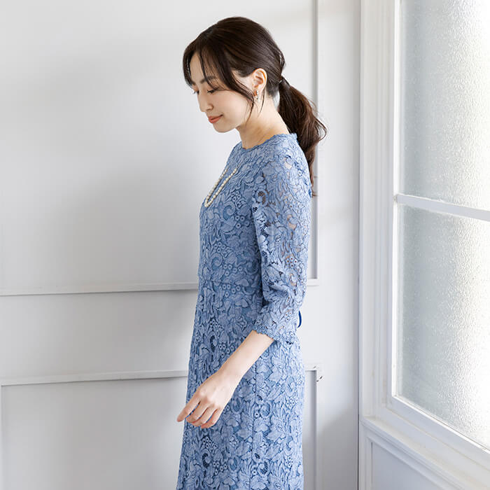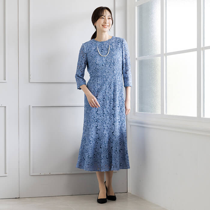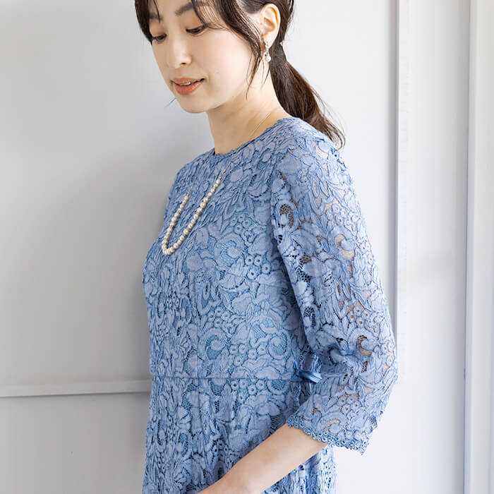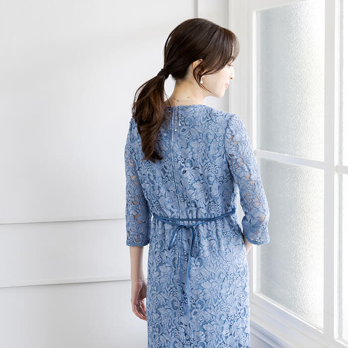 華やかな総レースが目を惹くエレガントで高級感のある一着。上品な透け感のある袖と、ソフトマーメイドシルエットがポイント。裾にかけて程よく広がるフレアが動く度に揺れ優美な印象を与えます。 取り外しできるリボンベルトで、コーディネートをアレンジできます。レースが主役のシンプルなデザインで、年代を問わず着こなせる1着です。結婚式やパーティーなど、特別な日を上品に彩ります。