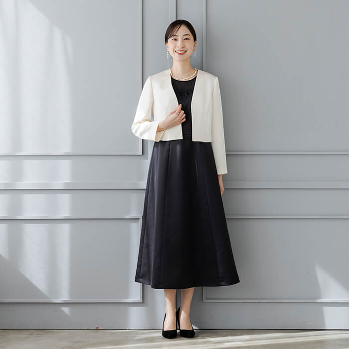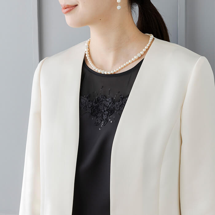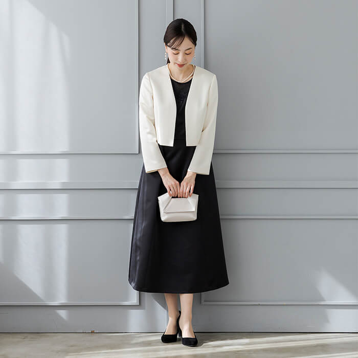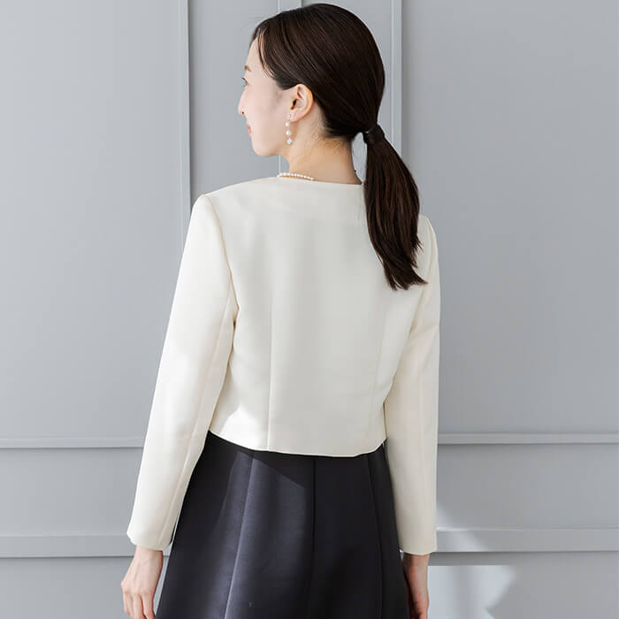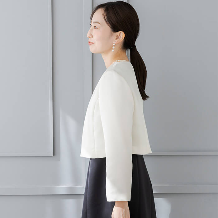 軽い仕立てでワンピースを引き立てる、ハリ感のあるマットな質感のサテン素材。ノーカラーと短めの着丈でコーディネ―トしやすく、羽織るだけで一気にフォーマルな雰囲気に。きちんとした日におすすめのジャケットです。