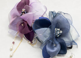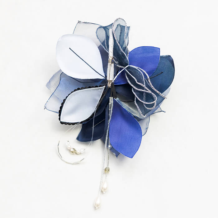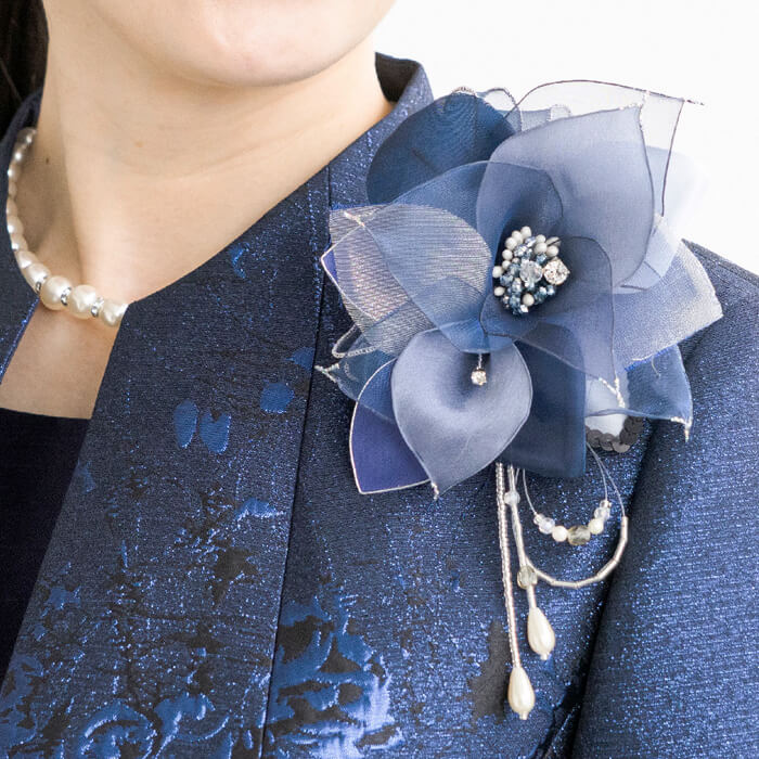 シルバーのリーフトリミングやスパンコール、ビーズ、パールなど、 さまざまな素材を組み合わせ、落ち着いた色味ながら華やかに仕上げました。