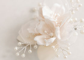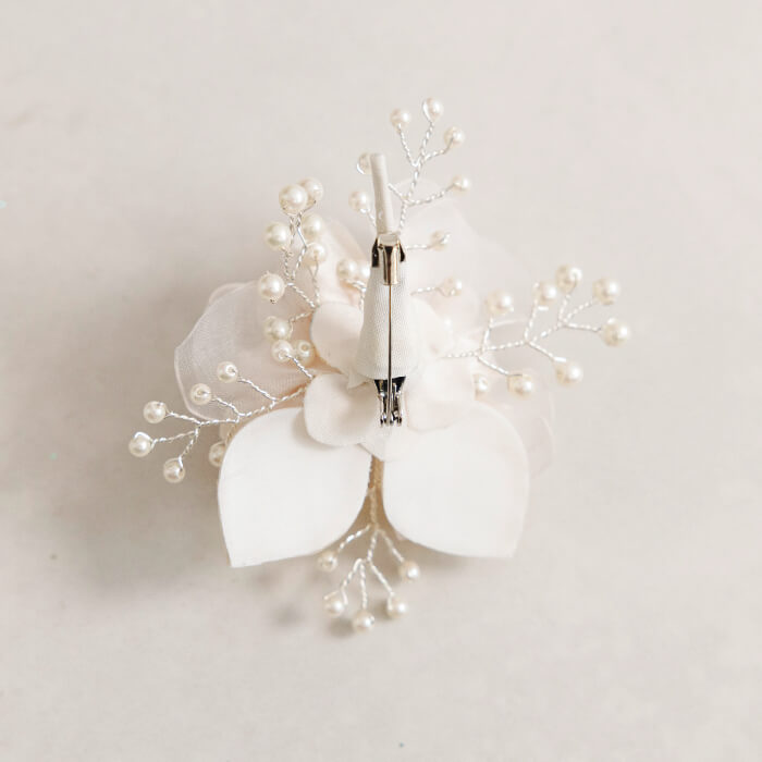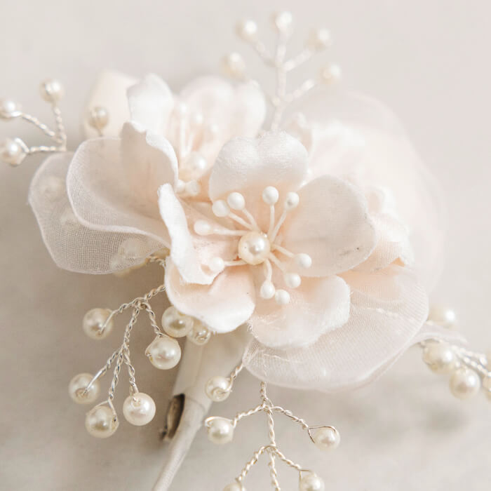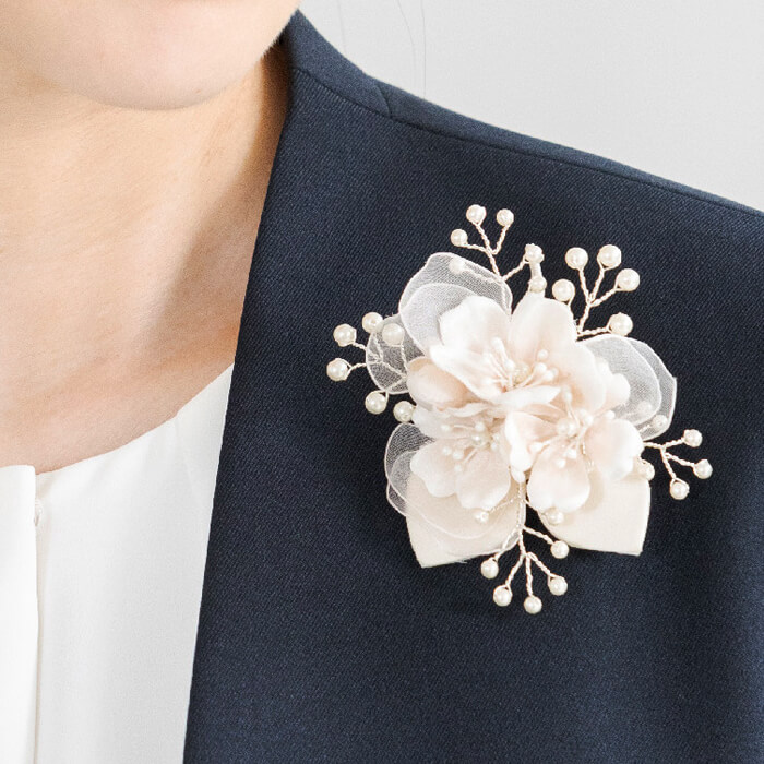 春の門出にぴったりの桜モチーフをあしらったコサージュは、 淡い桜色の花びらが光をふんわりと受け、顔まわりを優しくトーンアップ。