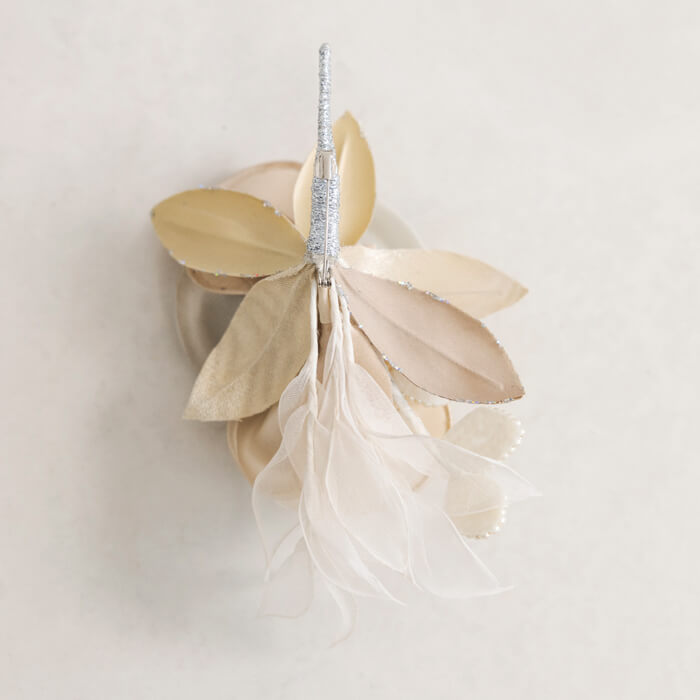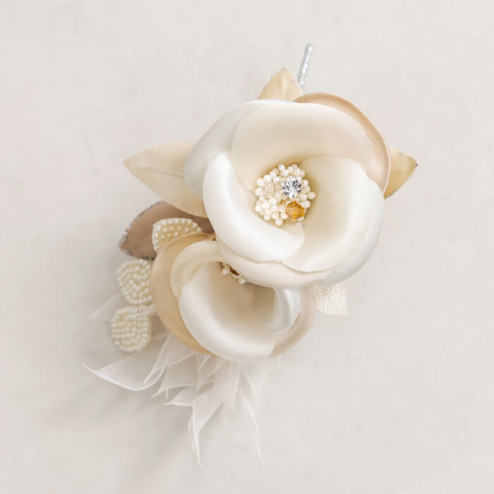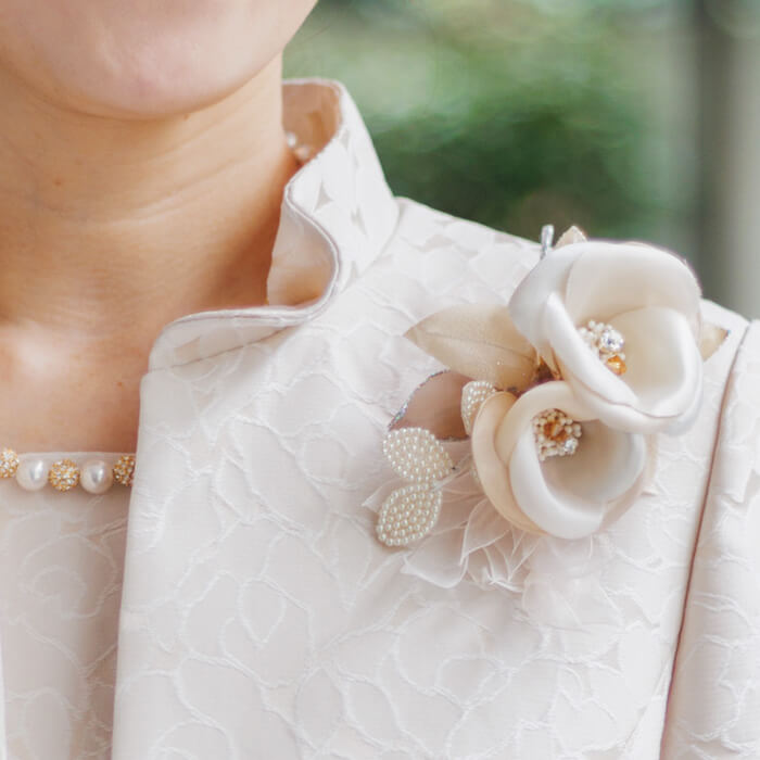 サテンの上品な艶感がエレガントな印象のコサージュ。