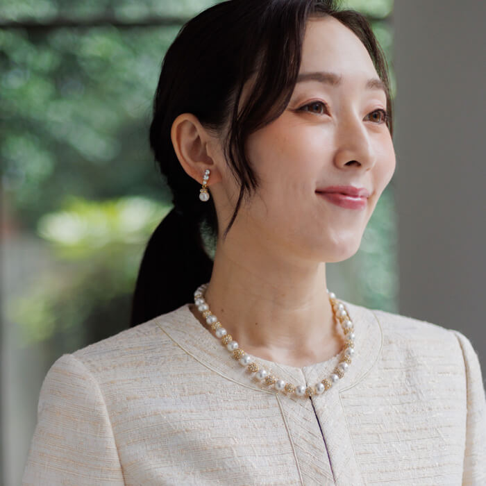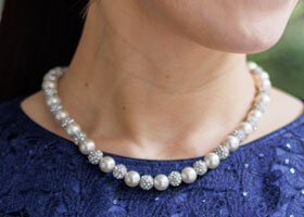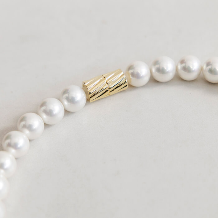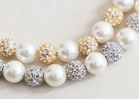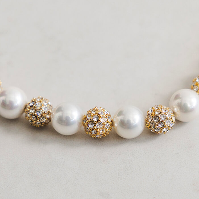 上品な光沢の磨き貝パールに、華やかなパヴェボールを組み合わせたネックレス。