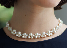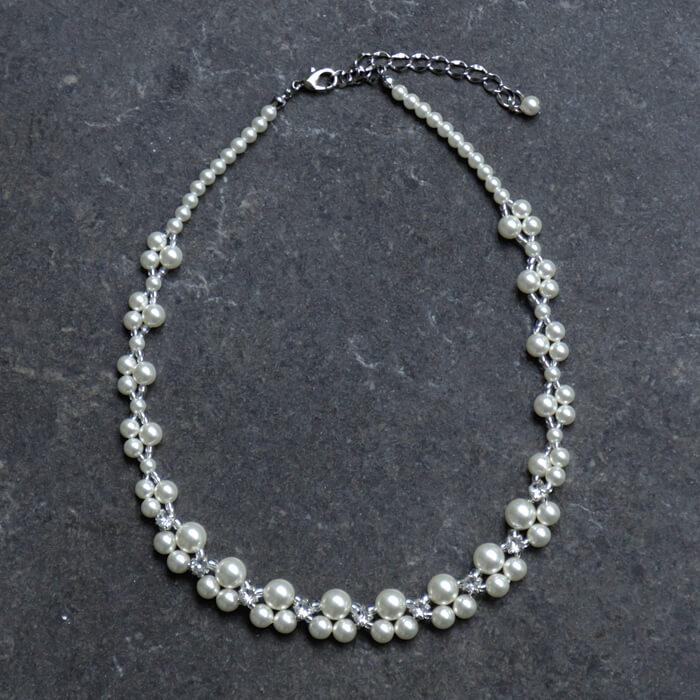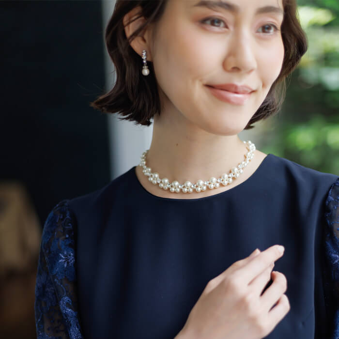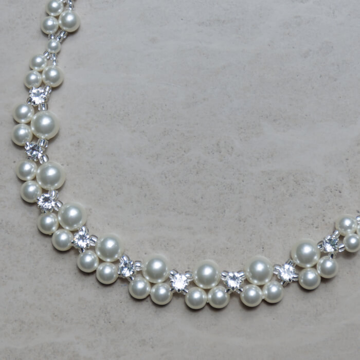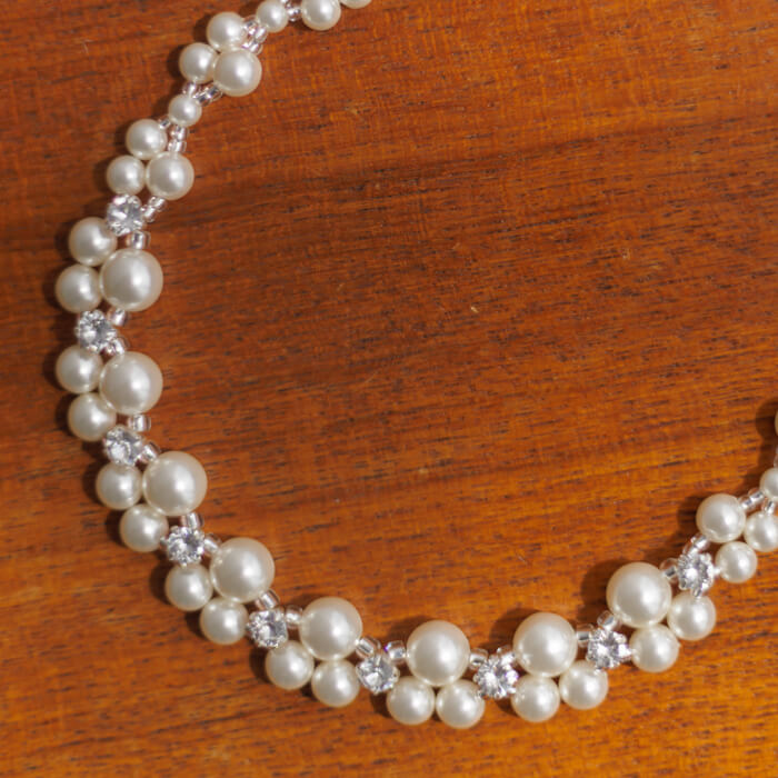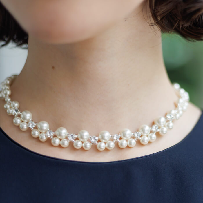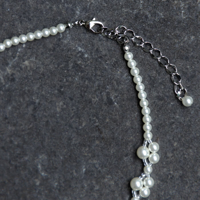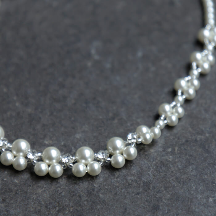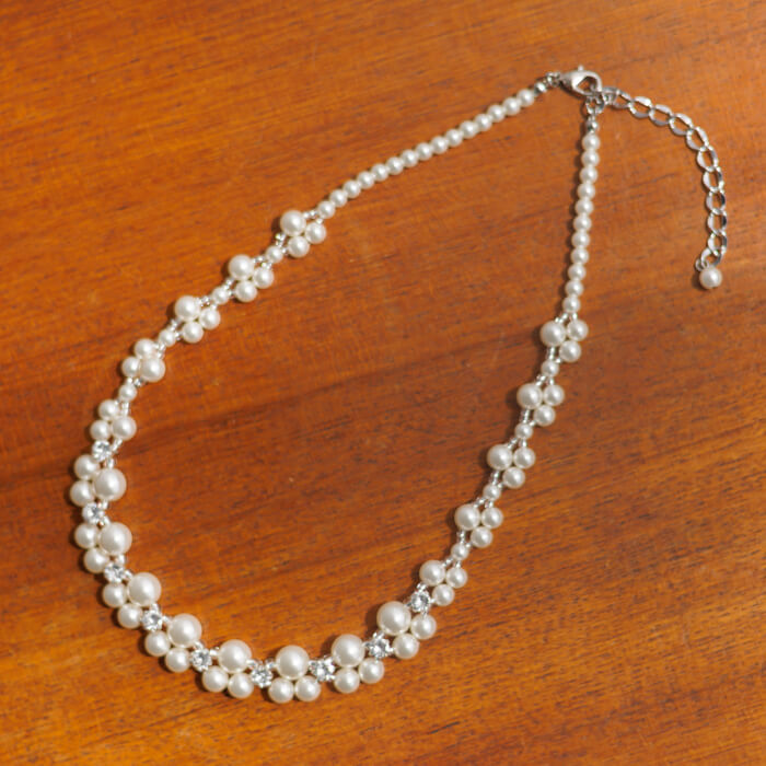 ストーンとパールをバランスよく編み込んだデザインネックレス。