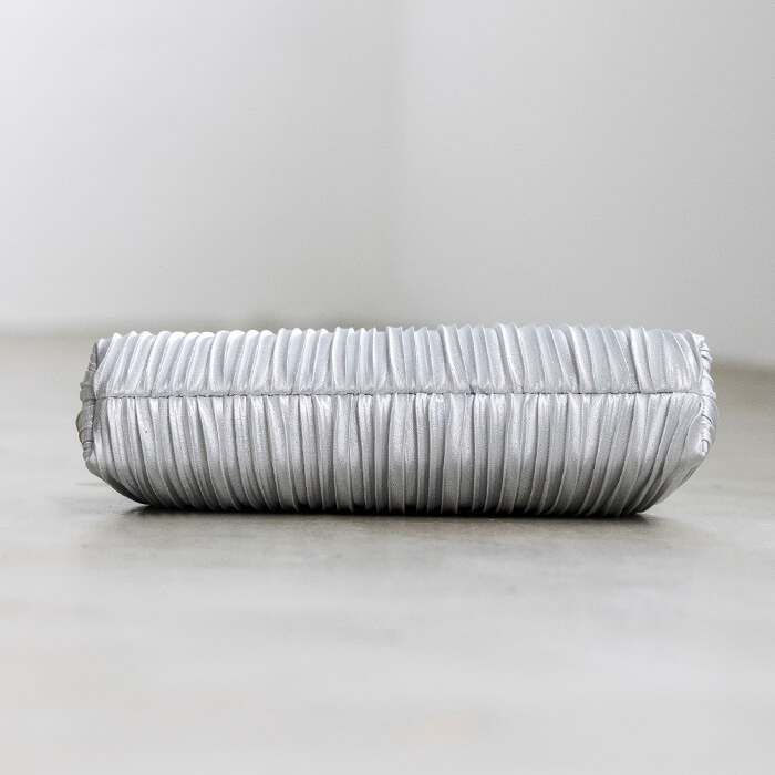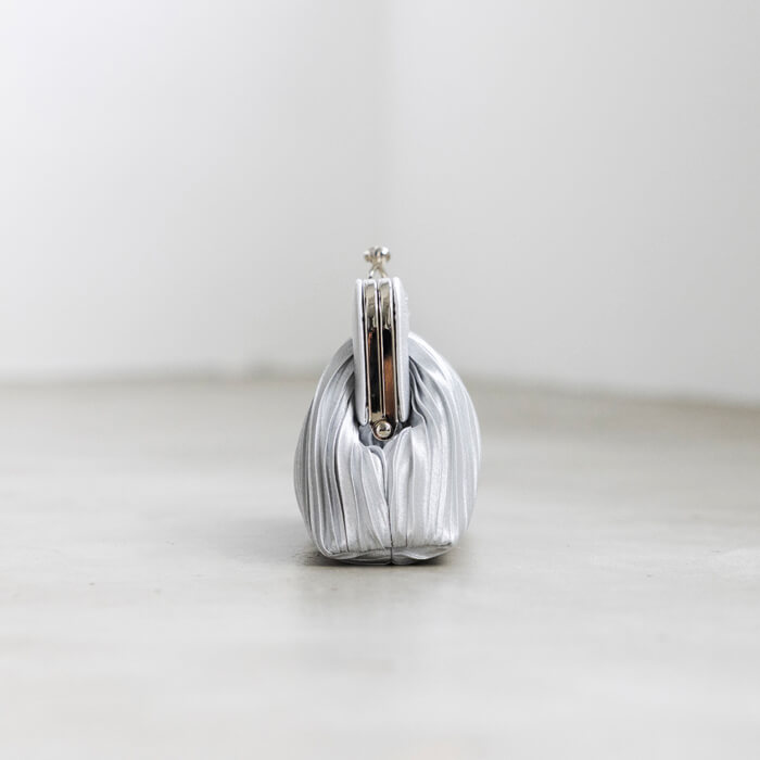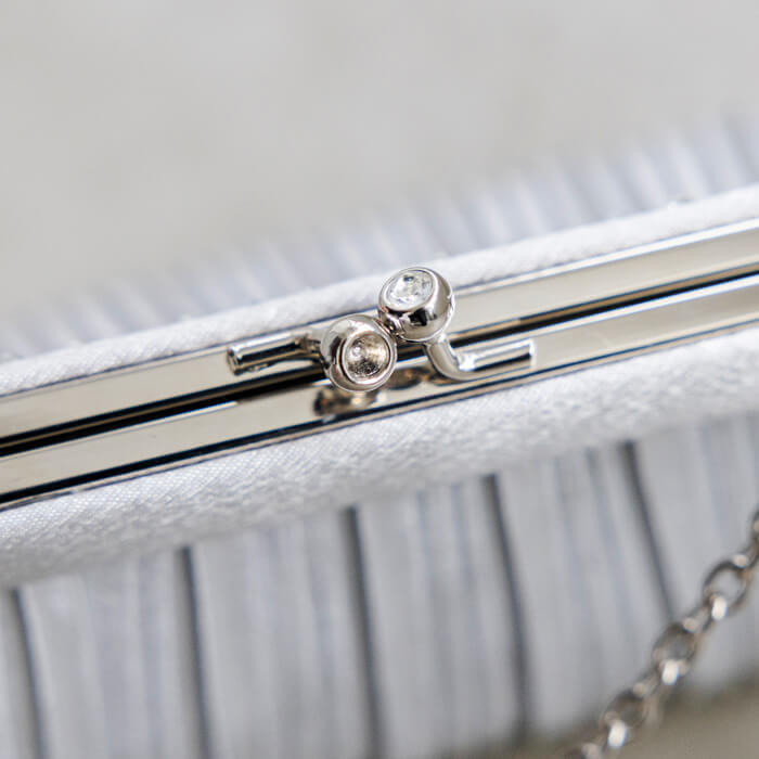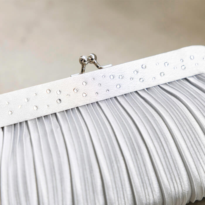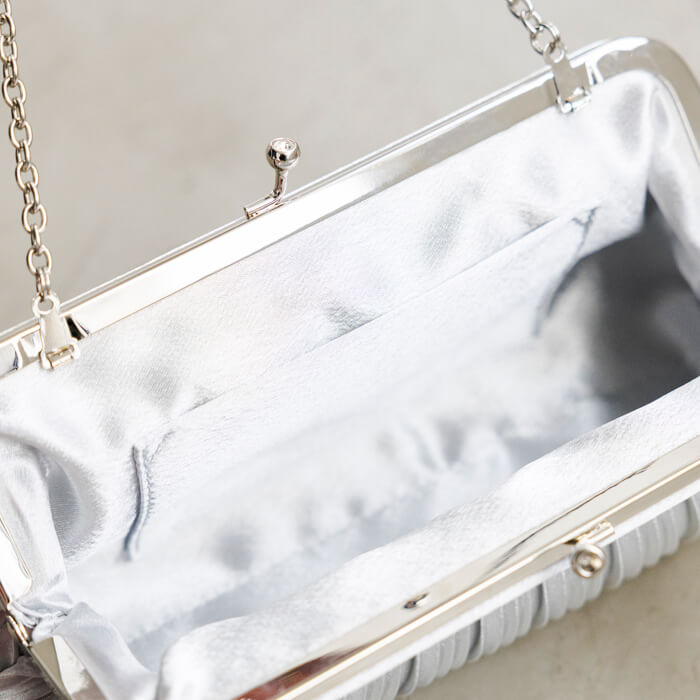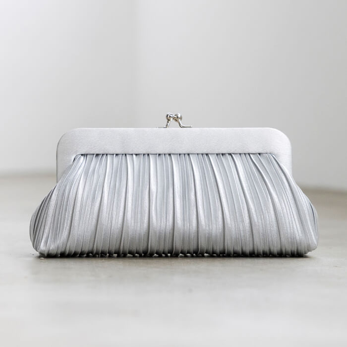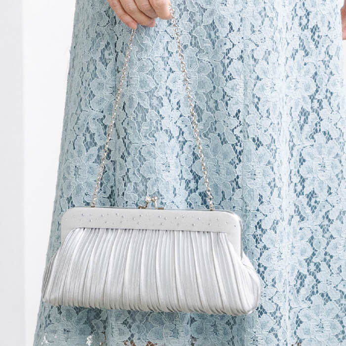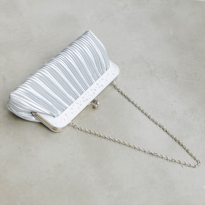 エレガントなプリーツ素材のがま口バッグに、ストーンアクセントで華やかに。