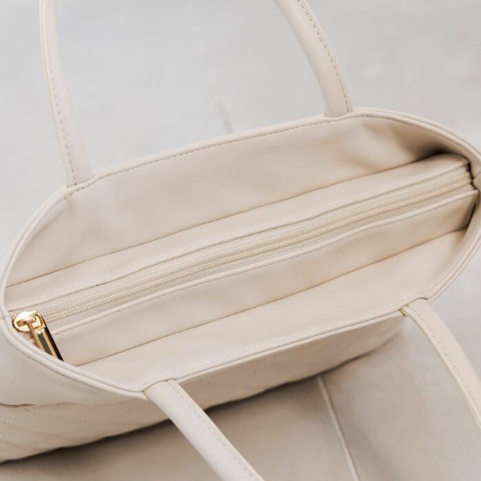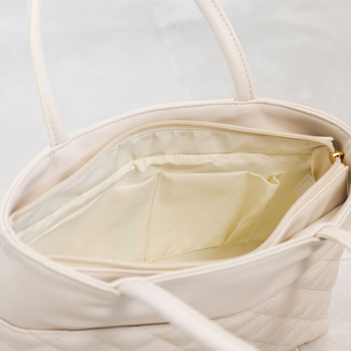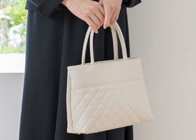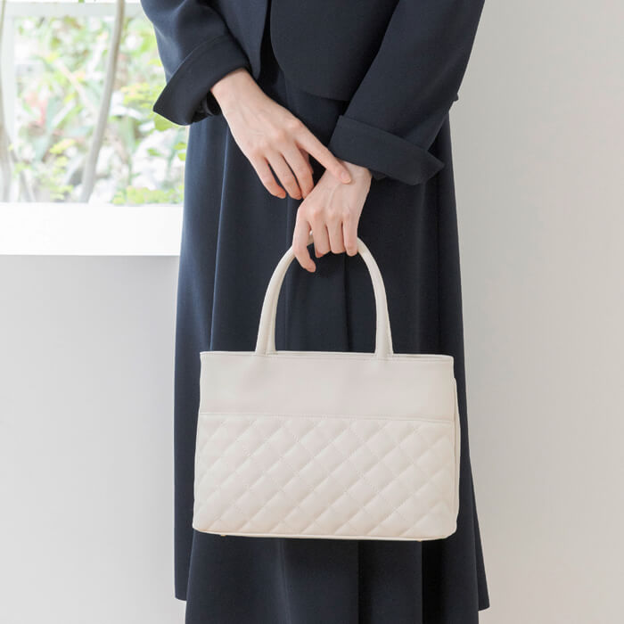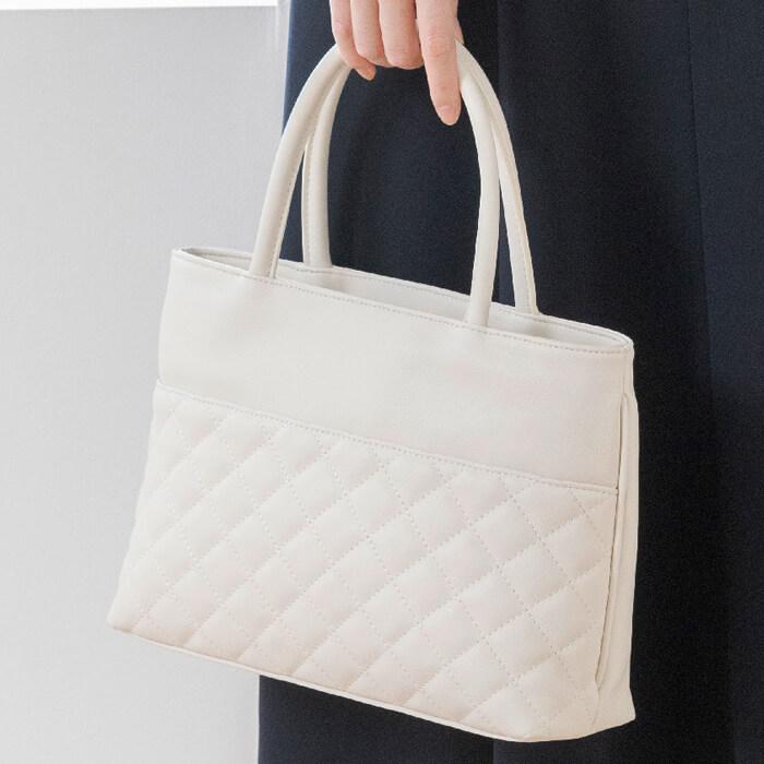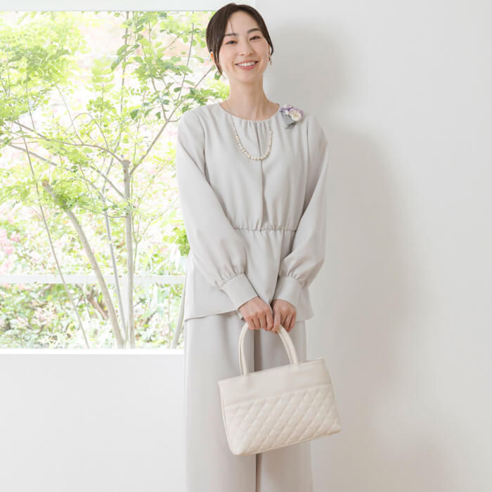春らしい明るいオフホワイトのバッグは、門出の式にぴったり。