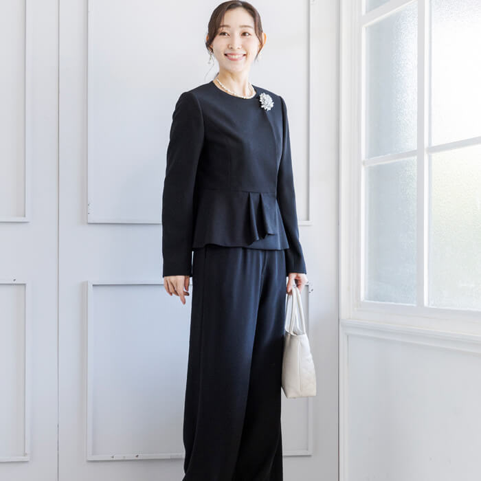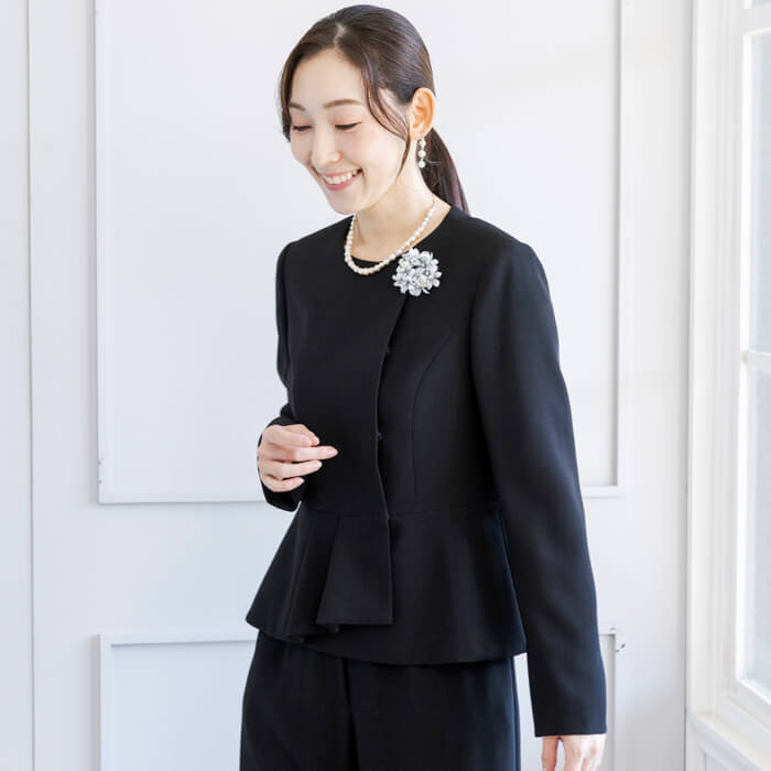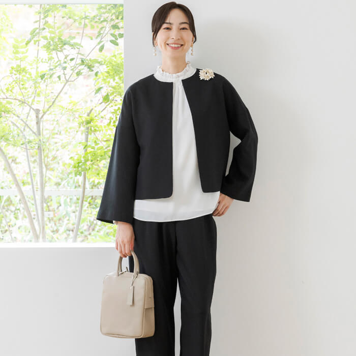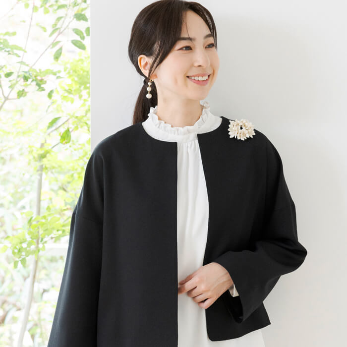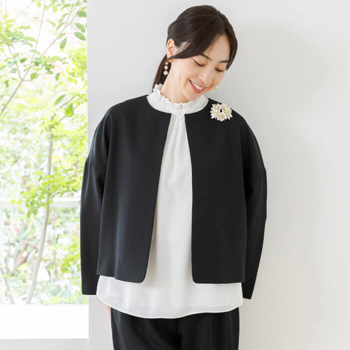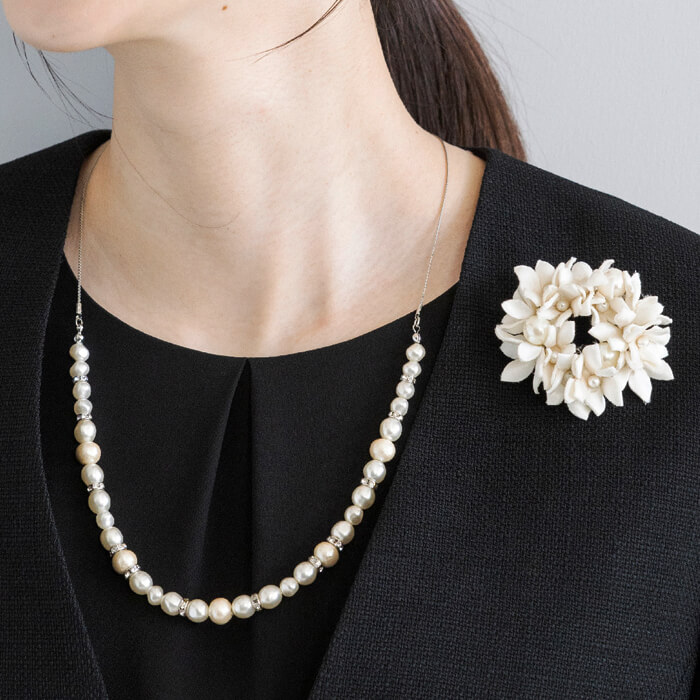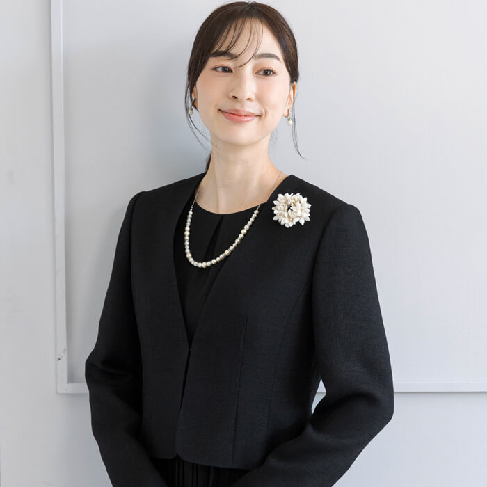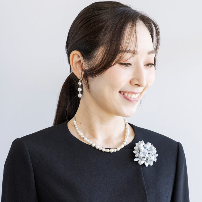 ※日本製 ※保管用のケースに入れてお届けします。 ※手作り品のため、1点1点表情が異なる場合もございます。 ※モデル着用 <グレー> ブラックフォーマル:0102940 / ネックレス:5519933 / バッグ:5520910 / イヤリング:5551991 <オフホワイト> ブラックフォーマル:4103690 / ネックレス:5519933 / バッグ:5520910 / イヤリング:5552454 ジャケット:2610901 / ブラウス:2606902 / パンツ:2607903 / バッグ:5820302 |