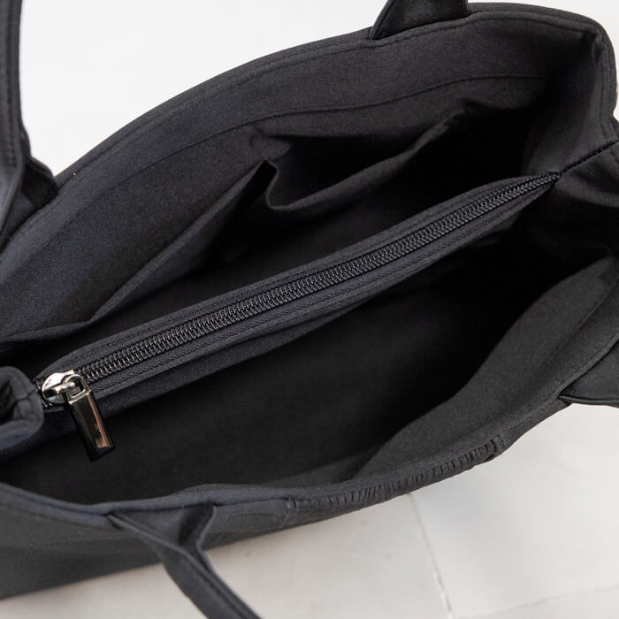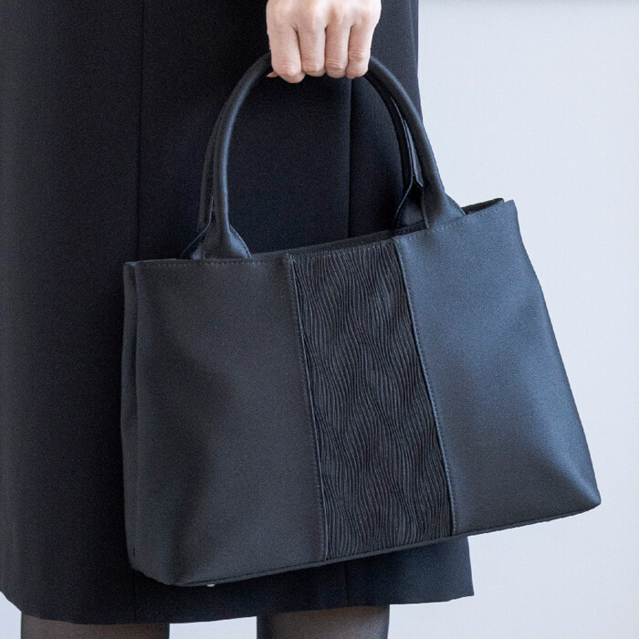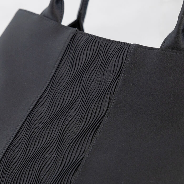 中央にランダムプリーツ素材をあしらった、舟形デザインのトートバッグ。