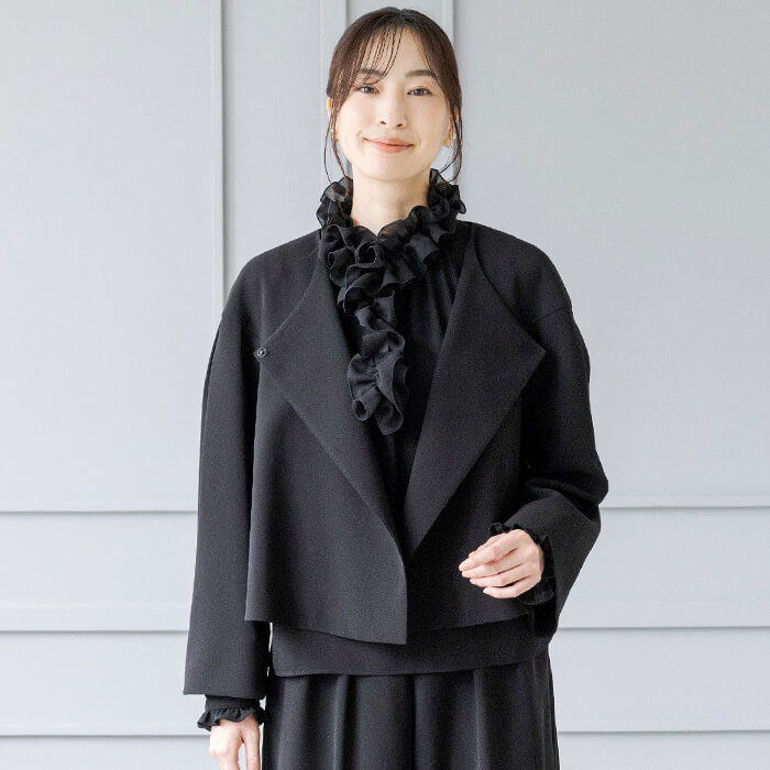 テーラードジャケットなどの首元が開いたジャケットにもぴったりです。