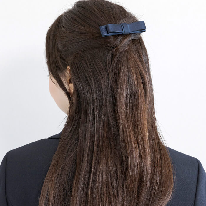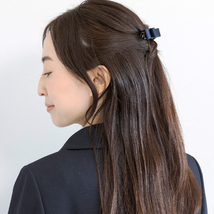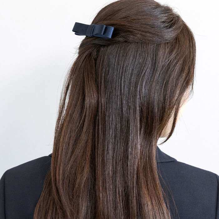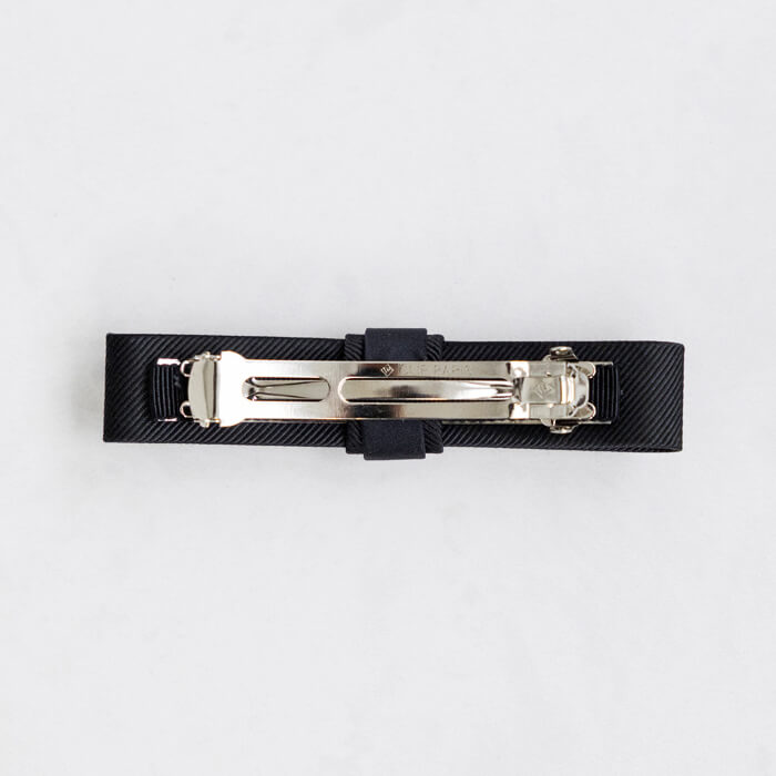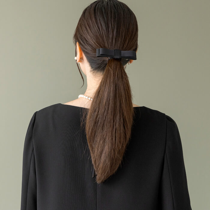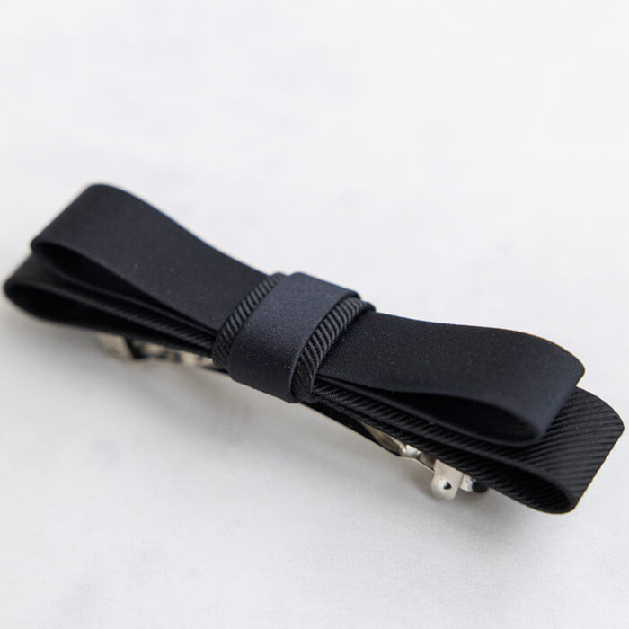 ストレートラインのリボンバレッタは、甘すぎないのであらゆるフォーマルシーンに最適。