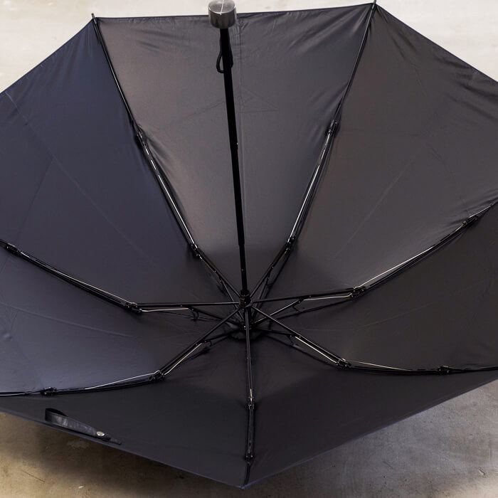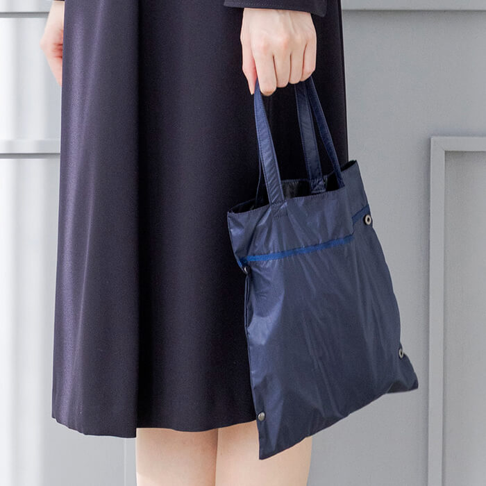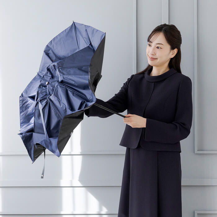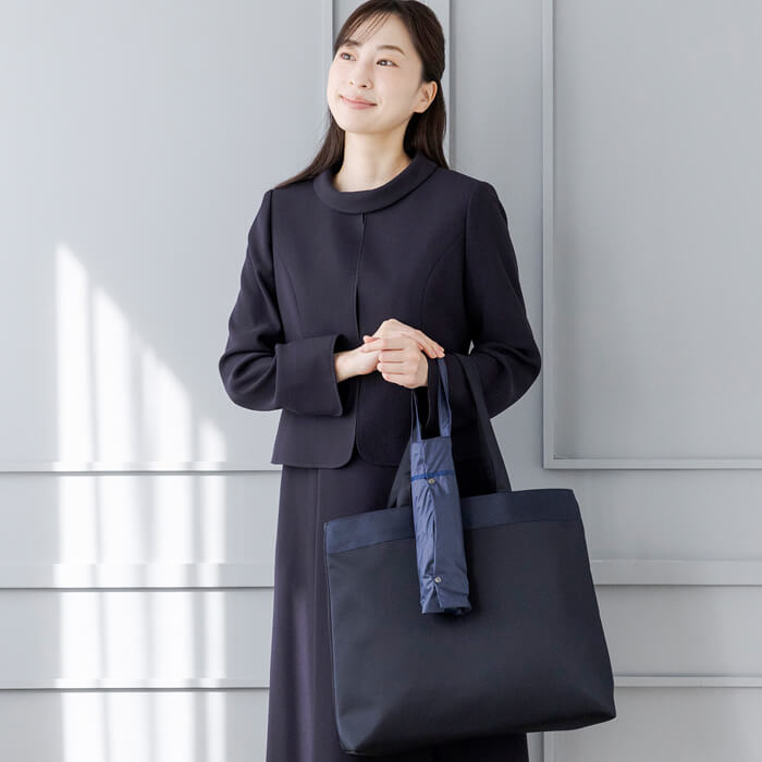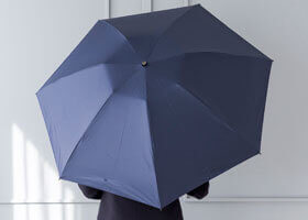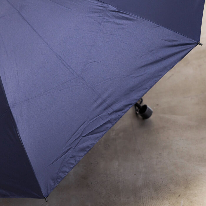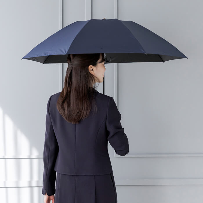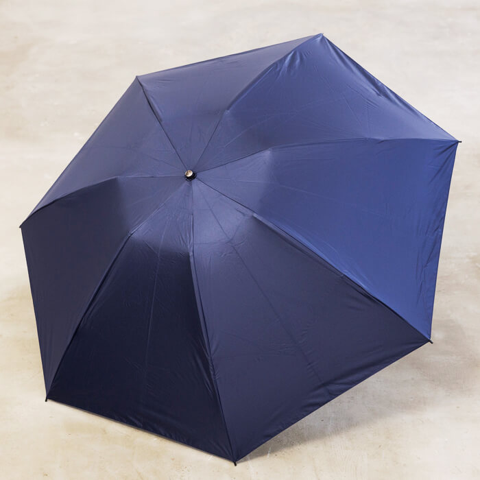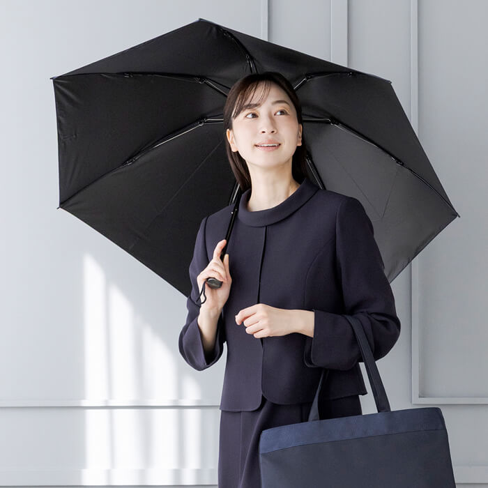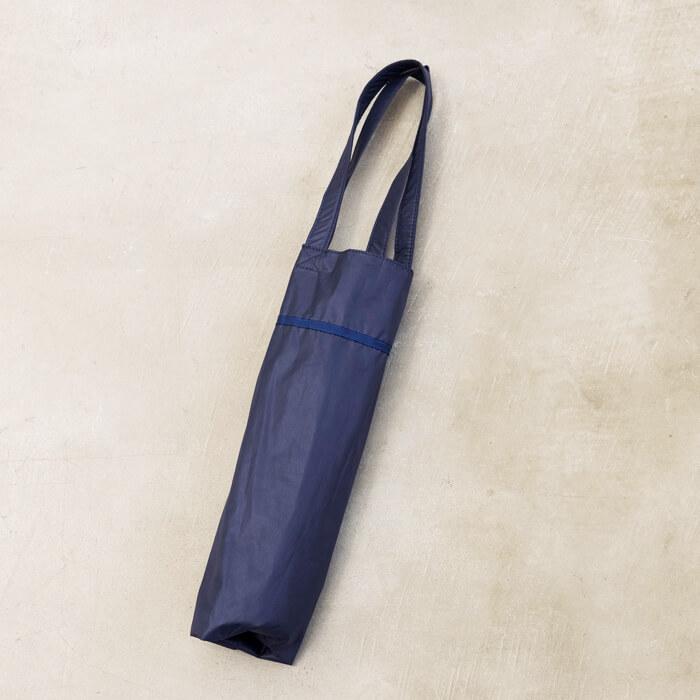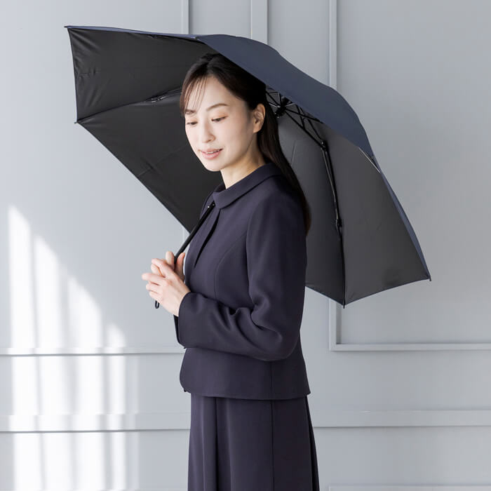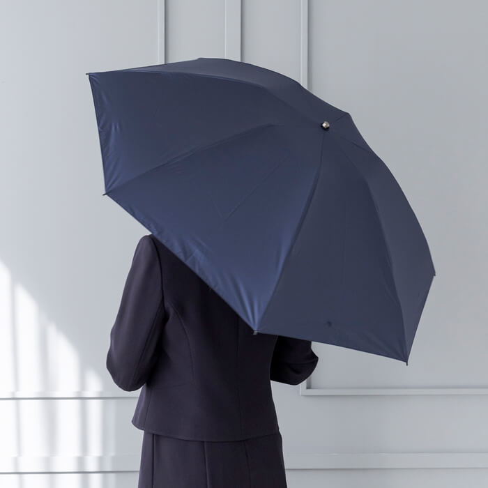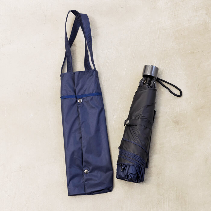 お洋服と揃えたネイビーの折り畳み傘を備えておくと、突然の雨にもスマートに対応できます。