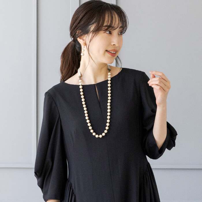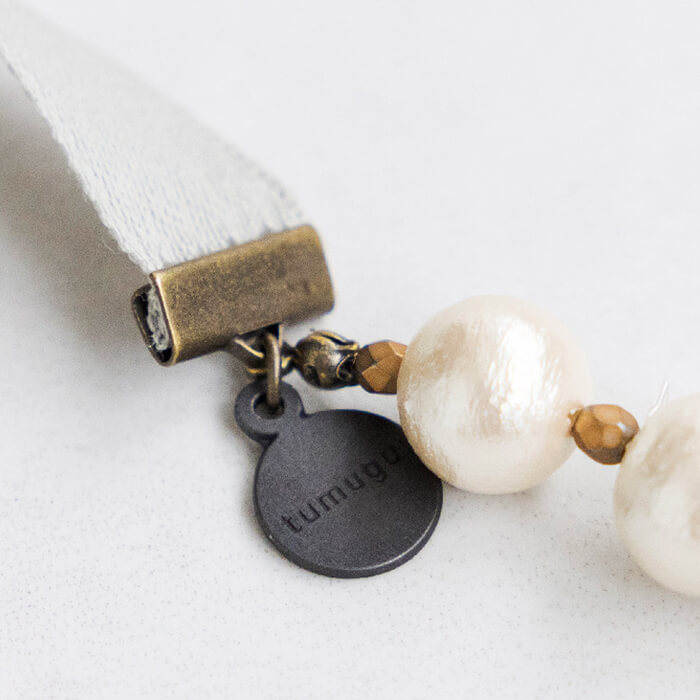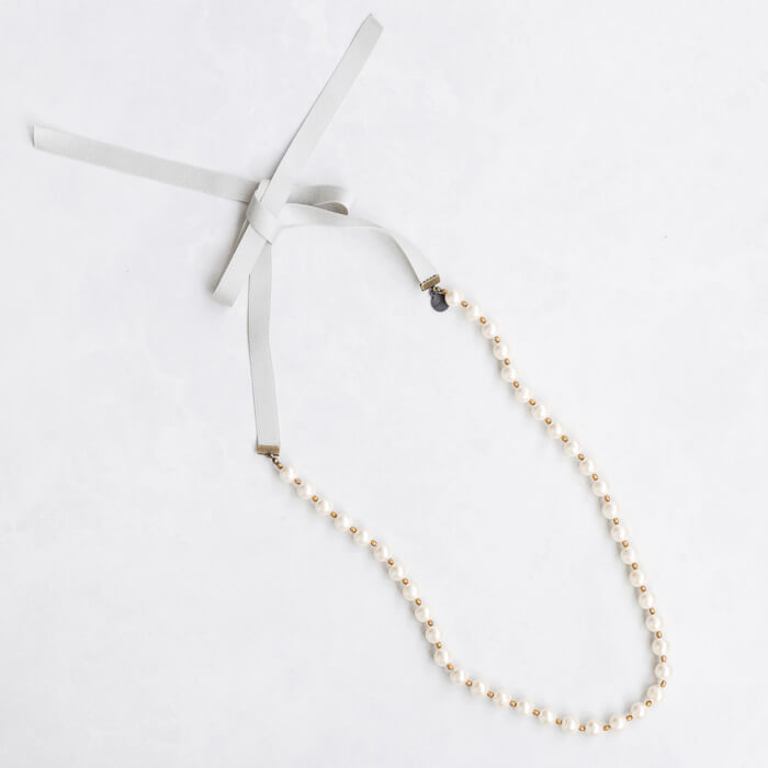 マットな質感のコットンパールにサテンリボンを組み合わせた、程よい甘さのネックレス。