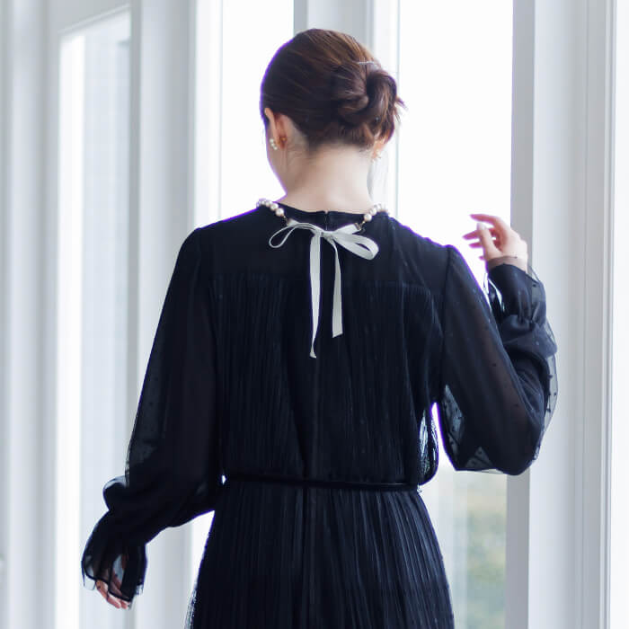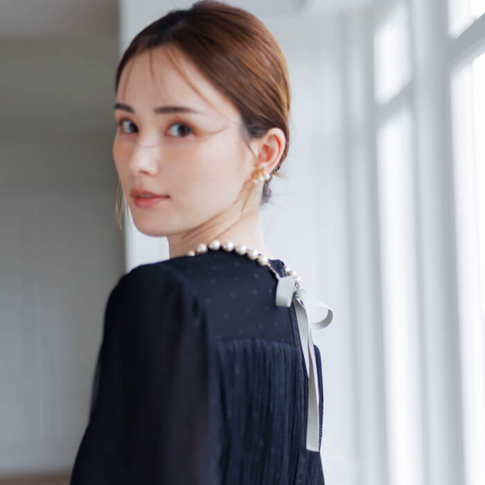 リボンの結び目の位置を変えて長さを調節し、お洋服に合わせて雰囲気の変化を楽しめるのも嬉しいポイントです。