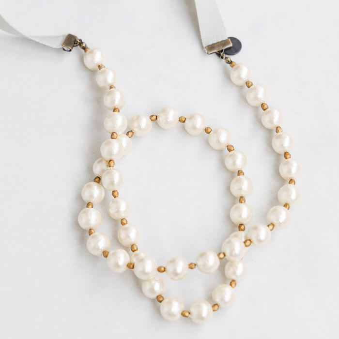 パールとパールの間にビーズを挟み込み、どこかアンティークな雰囲気を演出します。
