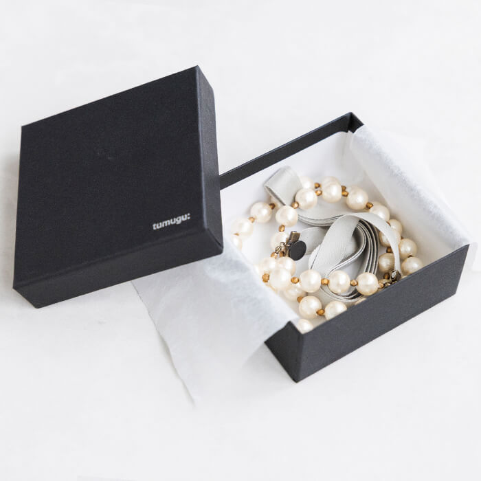 コットンパールとは、圧縮形成した綿にパールを塗装した日本発の模造真珠で、驚く程の軽さと暖かみを感じるナチュラルでマットな質感が特徴です。