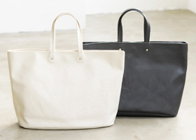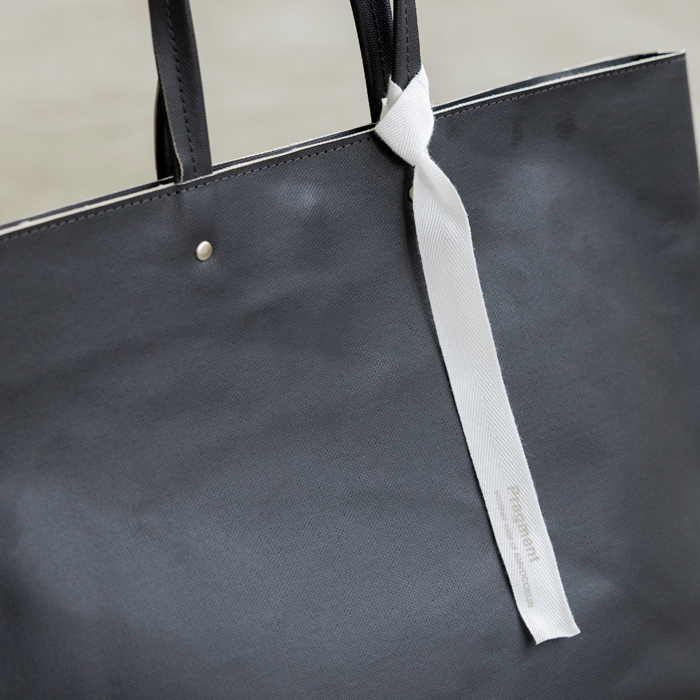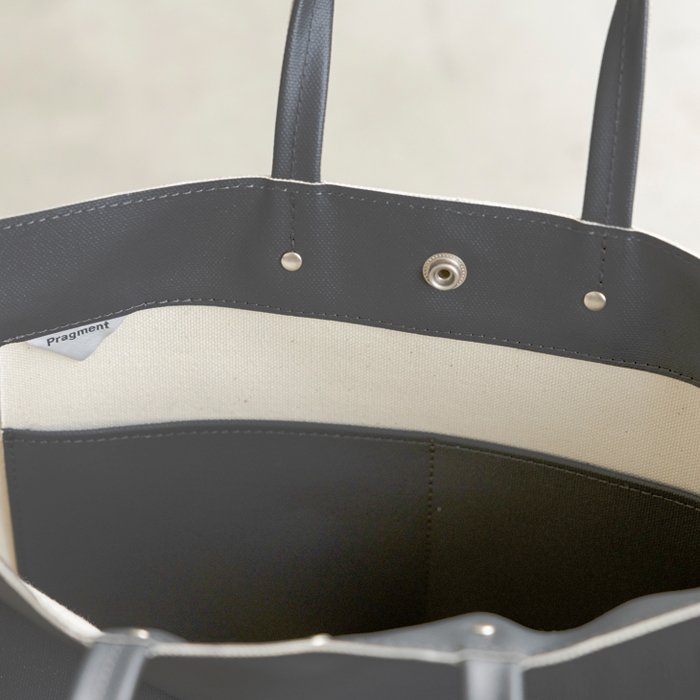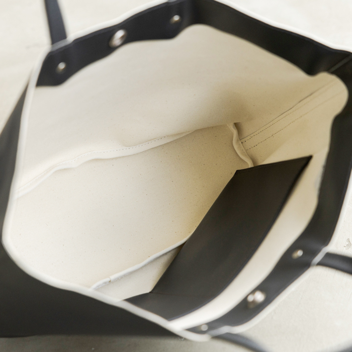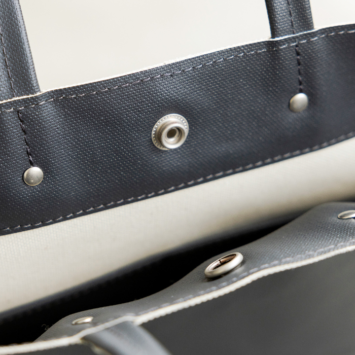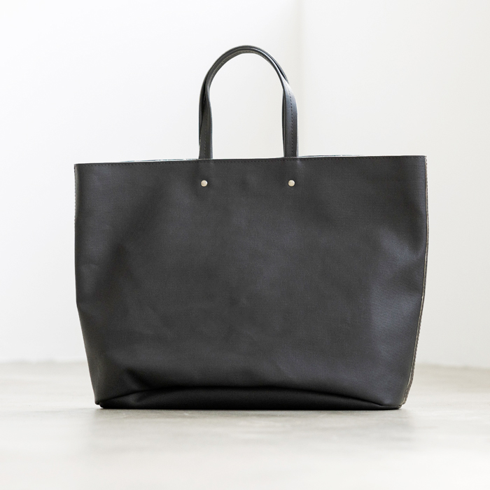 ハリとコシがあり丈夫な8号帆布にオリジナルカラーのPVC(ポリ塩化ビニル)加工を施したトートバッグ。