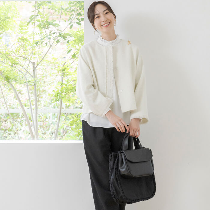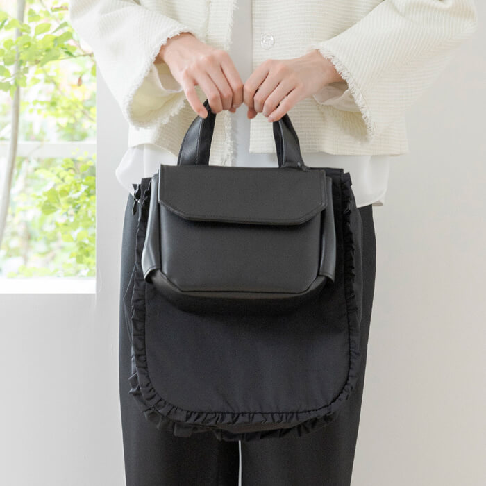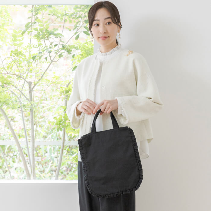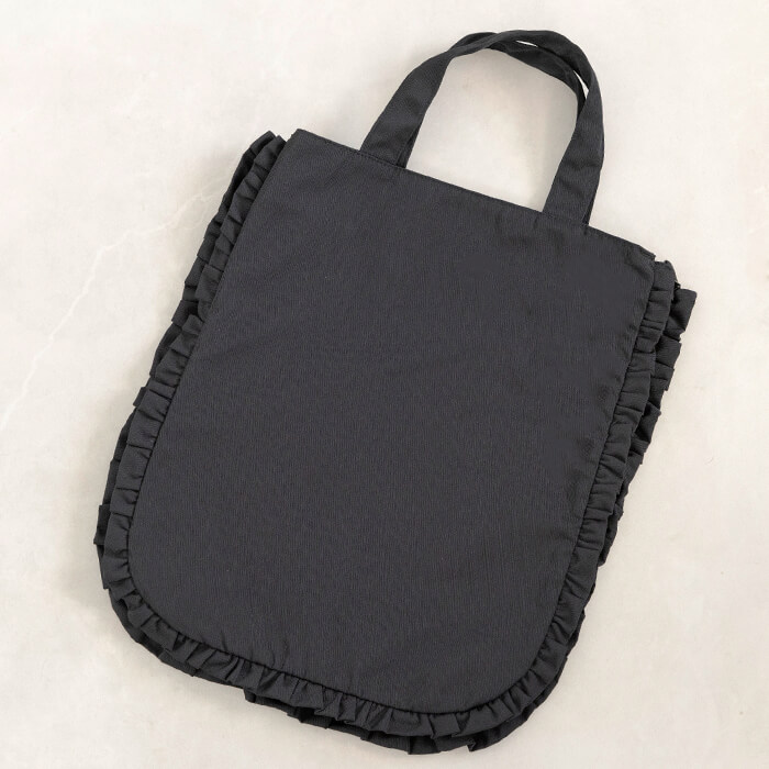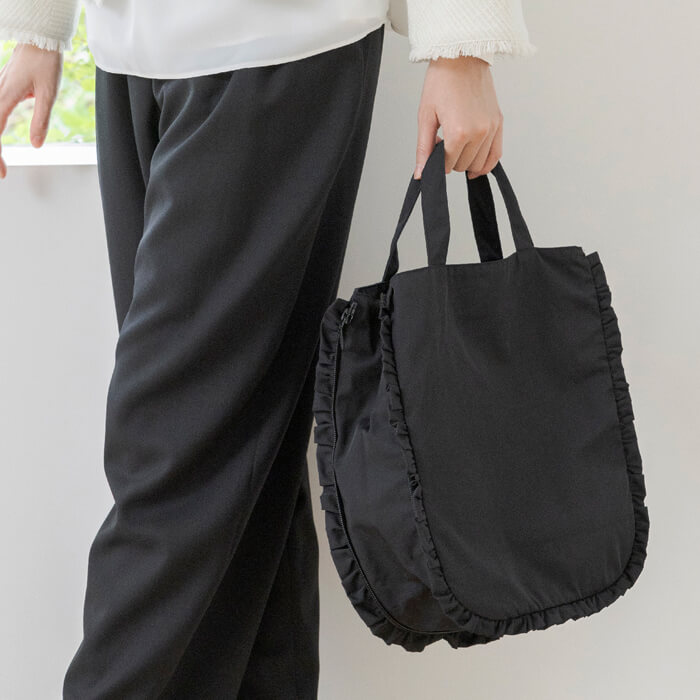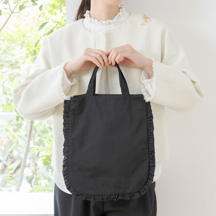 荷物の量に合わせてマチを開閉できる2WAYデザインと、手の込んだ2段フリルが魅力です。