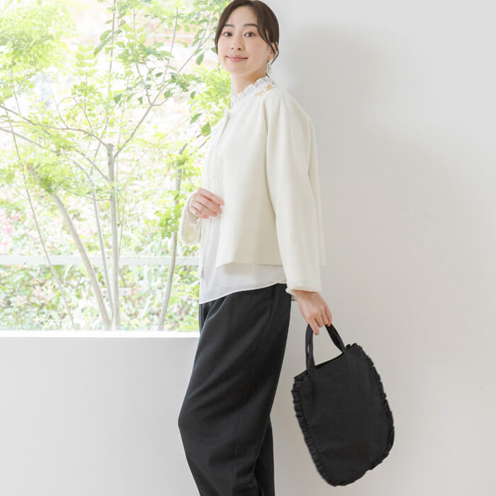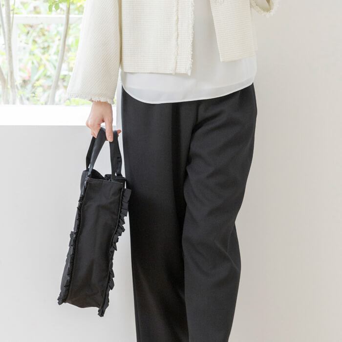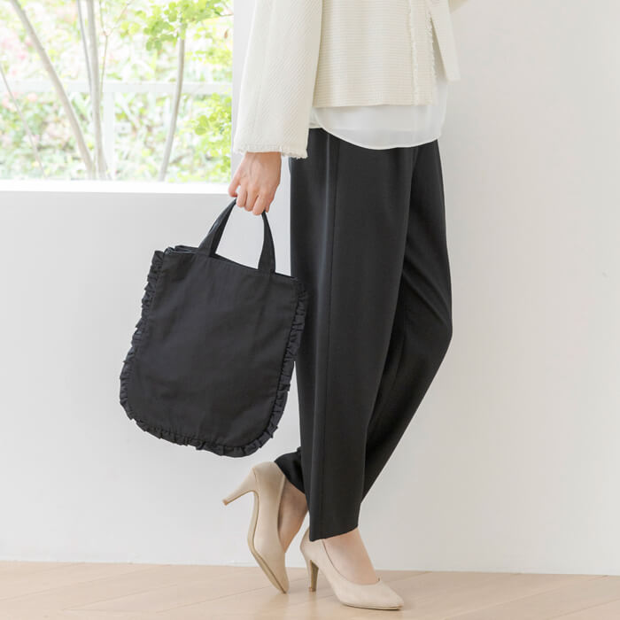 フォーマルシーンにも普段使いにも活躍するフリルデザインのトートバッグ。