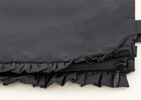 マチを閉じた時はペタンとしたコンパクトなバッグが、フリルとフリルの間に縫い込んだファスナーを広くと大容量トートに早変わり。