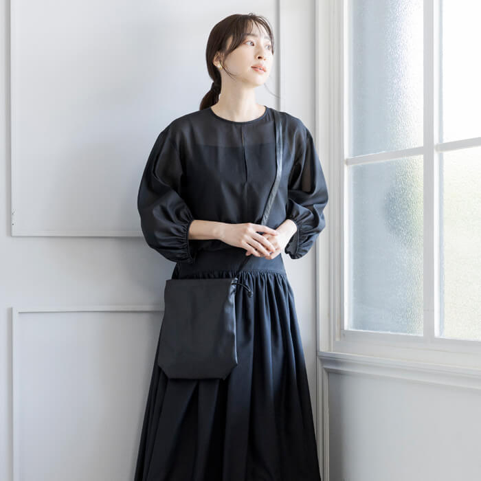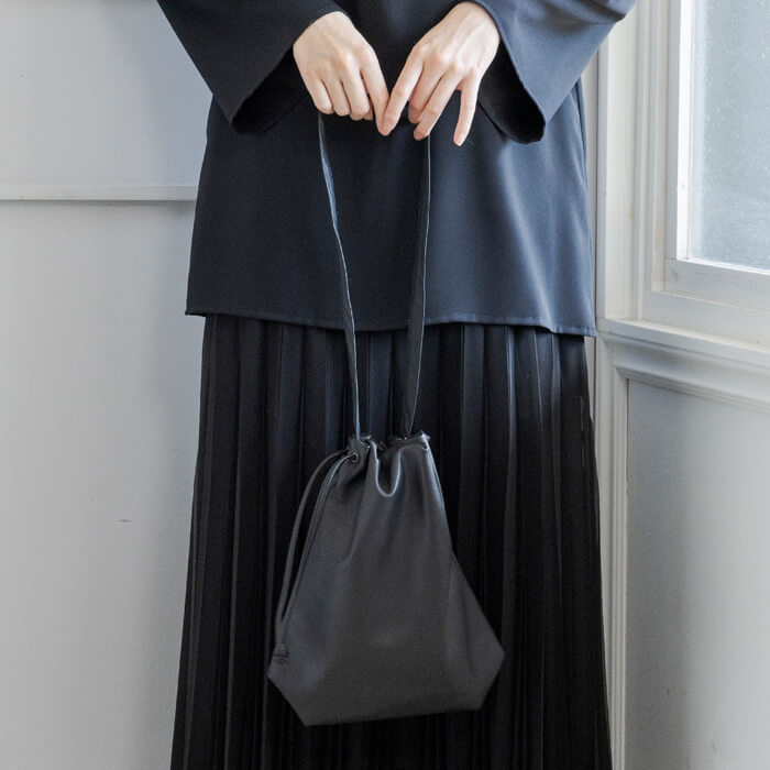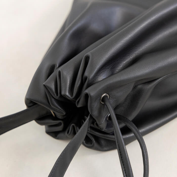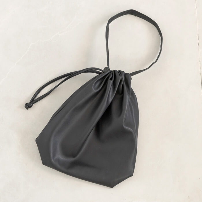 巾着のように口元を絞ることで生まれる立体的なシルエットと、素材が持つ上品な光沢感が相まって、 シンプルながらも存在感のある仕上がりに。
