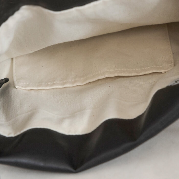 内側は生成り色の柔らかな綿素材で、中のものが見えやすく便利なポケット付き。