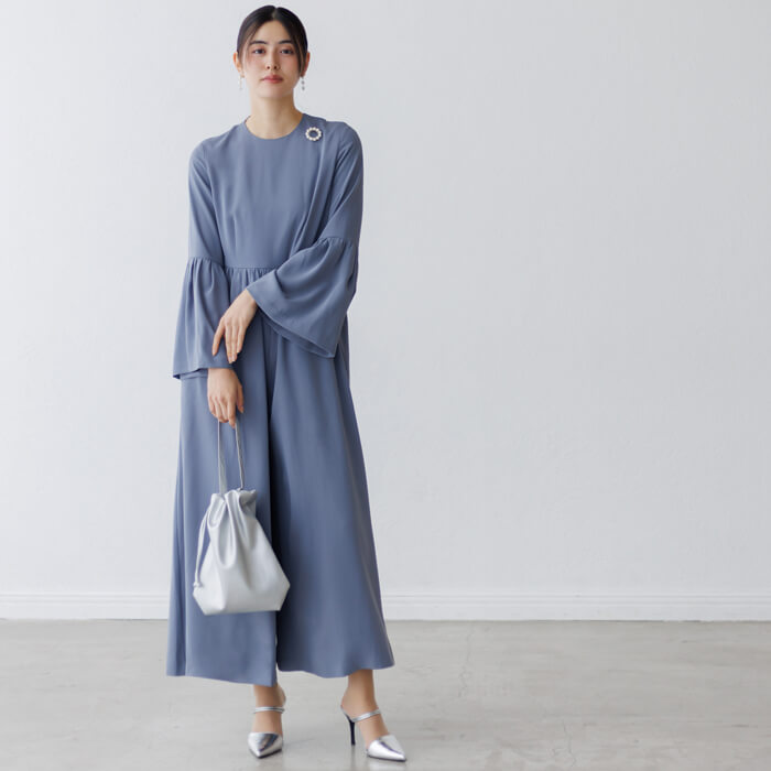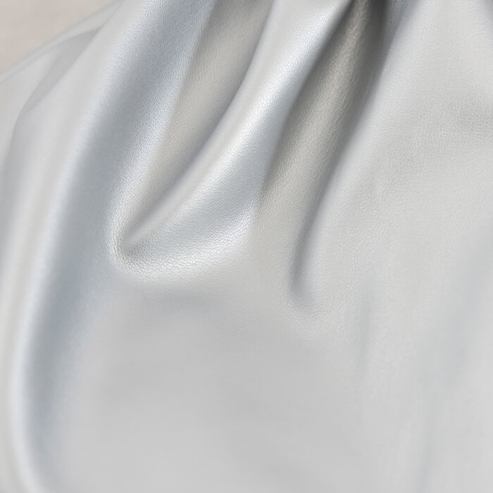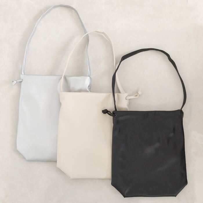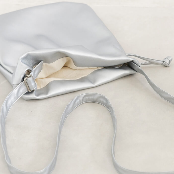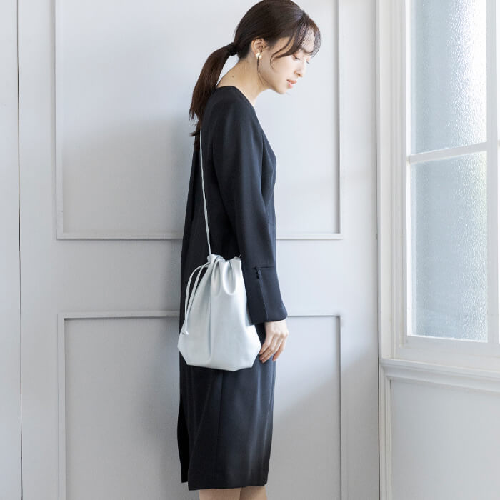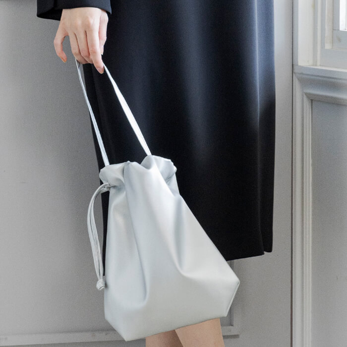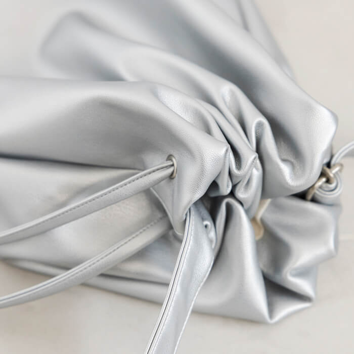 巾着のように口元を絞ることで生まれる立体的なシルエットと、素材が持つ上品な光沢感が相まって、 シンプルながらも存在感のある仕上がりに。