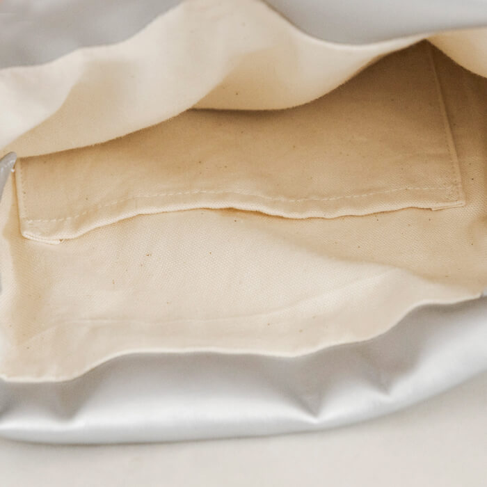 内側は生成り色の柔らかな綿素材で、中のものが見えやすく便利なポケット付き。