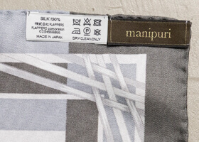 manipuriのスカーフは、日本の熟練職人が1枚ずつ手捺染し、端を手巻きで丁寧に仕上げております。