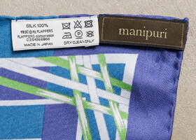 manipuriのスカーフは、日本の熟練職人が1枚ずつ手捺染し、端を手巻きで丁寧に仕上げております。