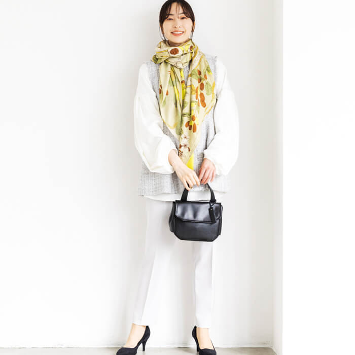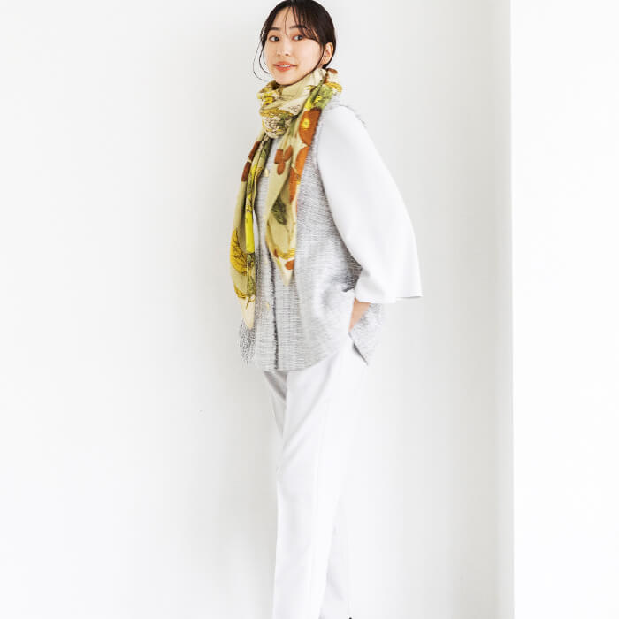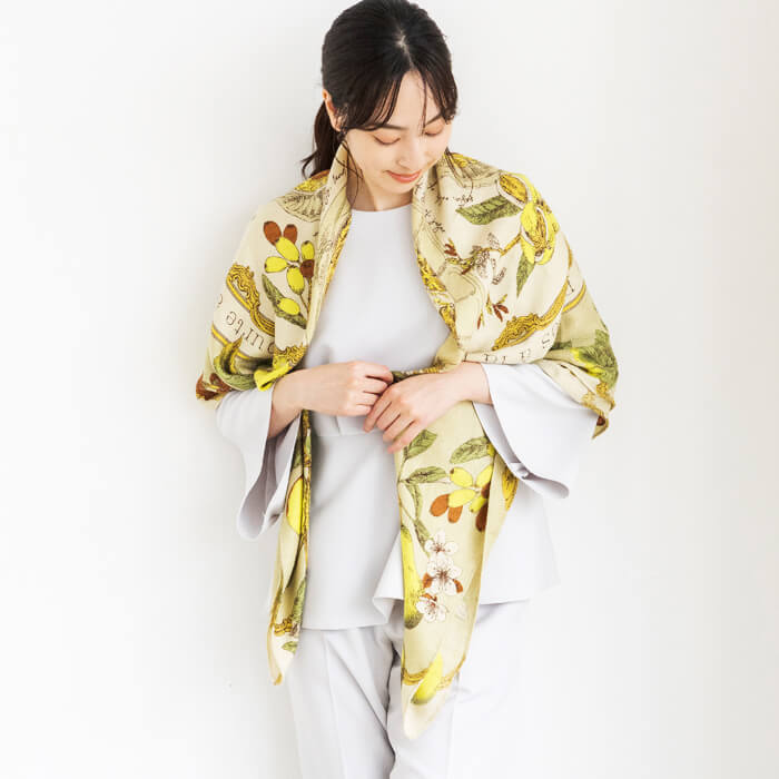 薄手で大判なストールは、ラフに首に巻いたり、肩に掛けたり、ひざ掛けにしたりとアレンジ自在。