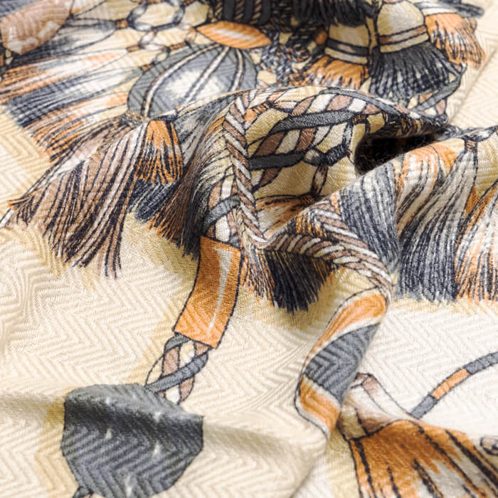 インド製のウール60%シルク40%の特注のヘリンボーン地に、manipuriのスカーフ柄が拡大プリントされた色鮮やかなストール。
