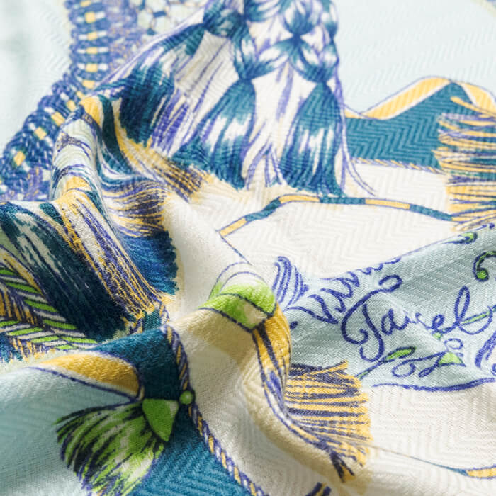 プリントの加工はシルクスカーフのプリント技法と同様にインドの職人によって1枚ずつ丁寧に手㮈染されています。