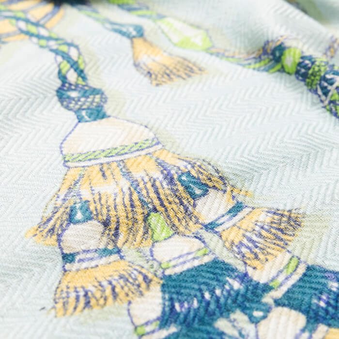 音楽用語で「活発」を意味するVivaceの通り、画面から飛び出すようにタッセルが四方に動く瞬間を描いたダイナミックな柄です。