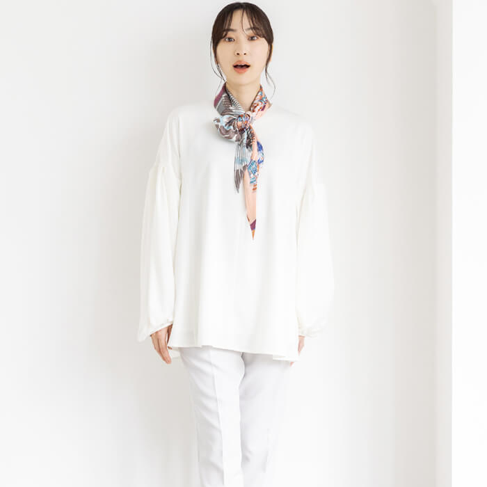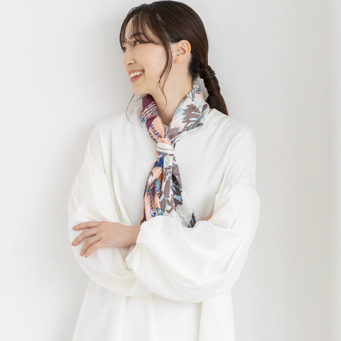 細長い形状なので折りたたむ必要がなく、そのまま首にかけて胸元でサッとひと結びするだけで、 簡単にボウタイ風に仕上がりスカーフ初心者さんにもおすすめです。