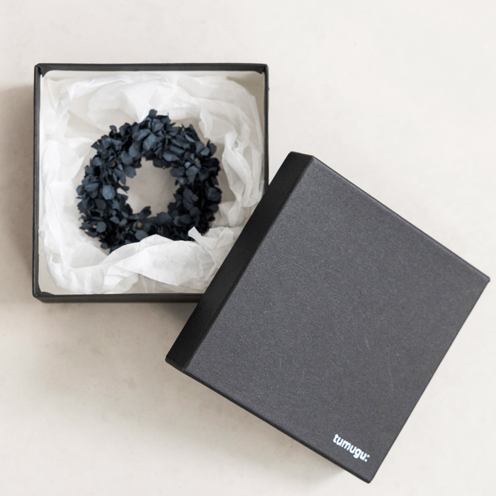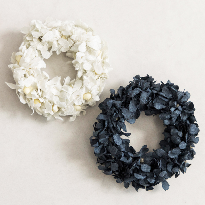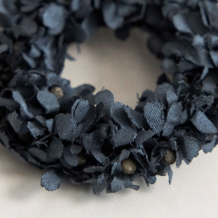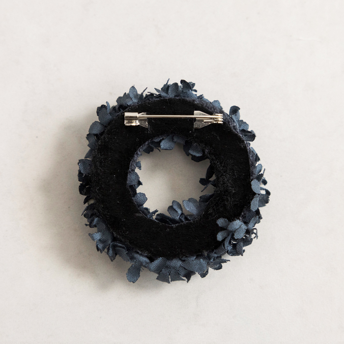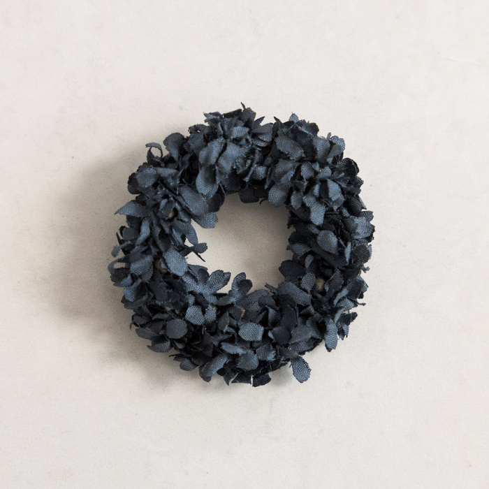 サークル状に配した小さな布花は、アイボリーや深みのあるチャコールをにじませたニュアンスカラーで染め上げ、柔らかな陰影を演出。