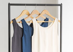 シンプルなタンクトップシャツは、上にトップスを着た時に「見えない」ことを重視し、 襟ぐりや肩まわりの開きが深めのデザインになっているのが特徴。