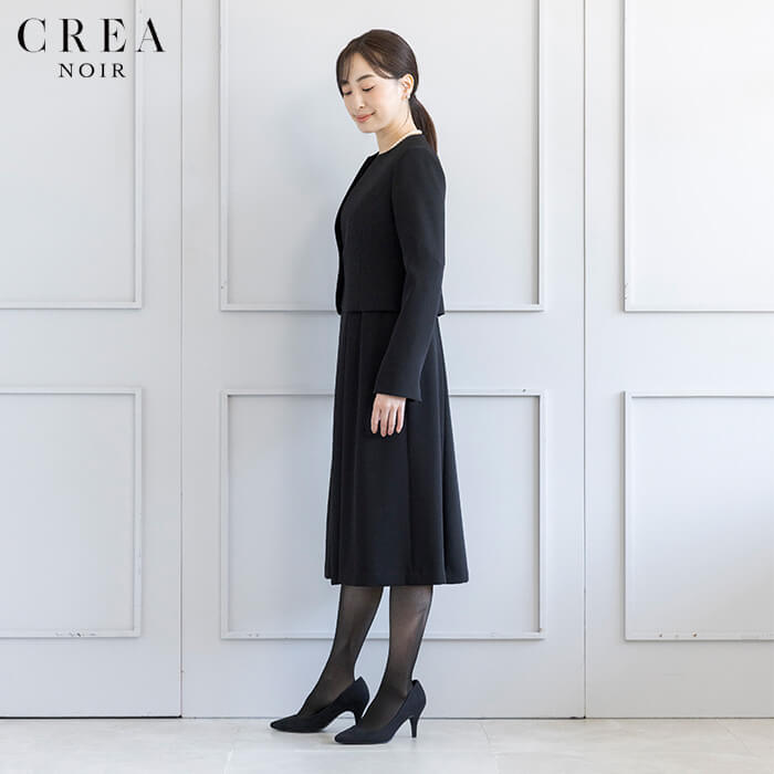 ファッション雑誌「CREA」との提携ブランド「CREA NOIR」。初めて用意するファーストフォーマルに最適なシンプルフォルムのブラックフォーマル。すっきりとしたノーカラーから見えるワンピースのレースがポイントのアンサンブル。ジャケットのコンパクトな着丈とワンピースのAラインシルエットがフェミニンな印象。