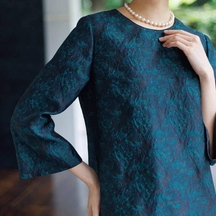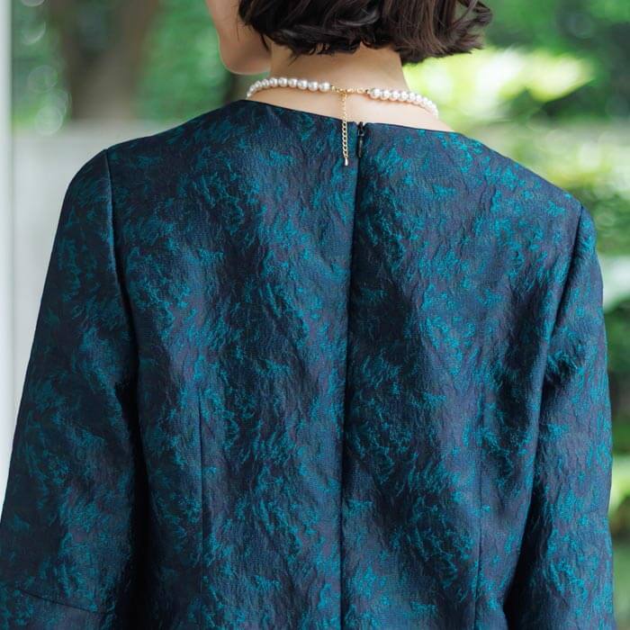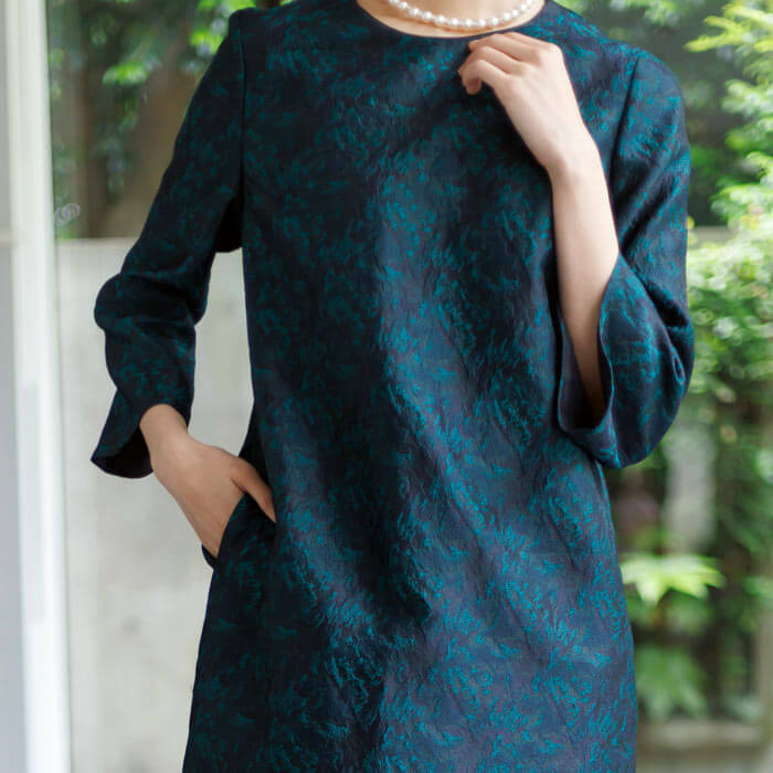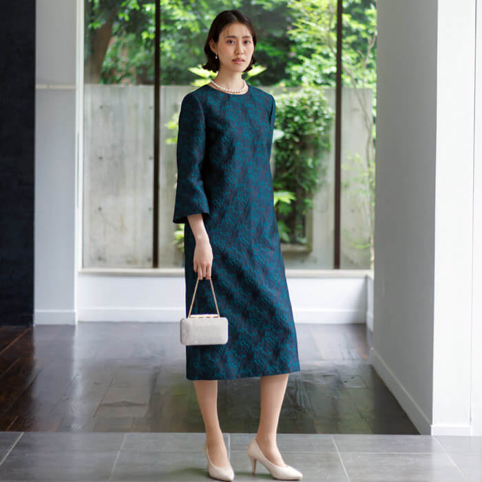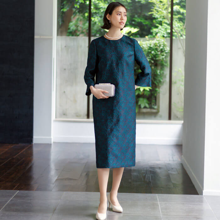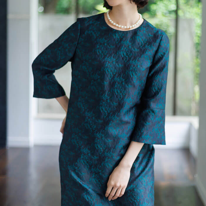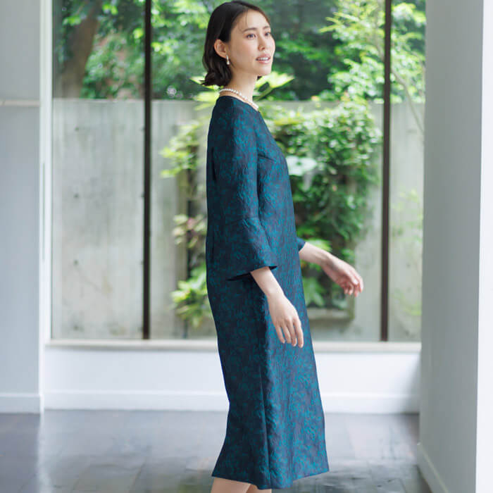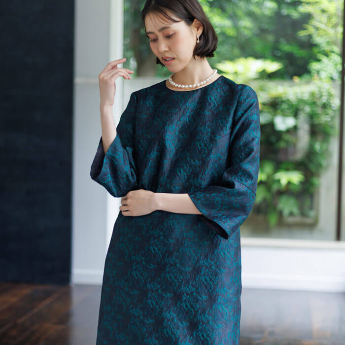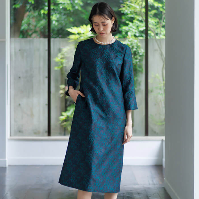 立体感のある織り柄が上品な存在感を放つ、フォーマルワンピース。 しぼりを入れずに仕立てた、ゆとりのあるシルエットが気になる部分を自然にカバーします。 ラメ糸を織り込んだ華やかな生地を贅沢に使用し、大人の気品を引き立てる一着です。 袖丈は軽やかな8分丈で、手元をすっきり見せてくれます。