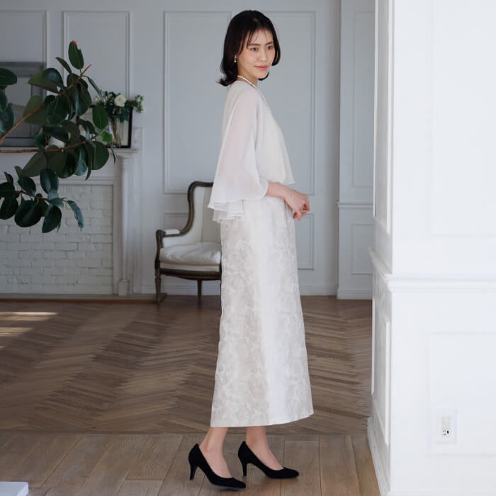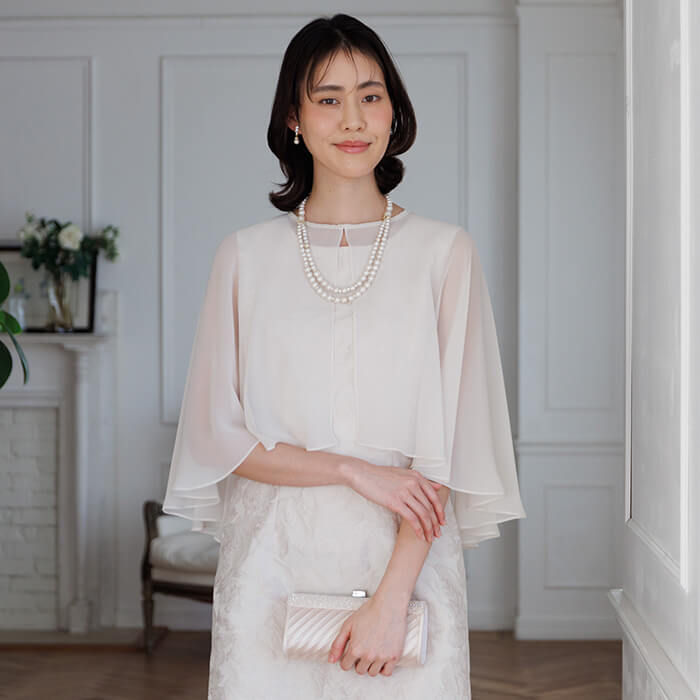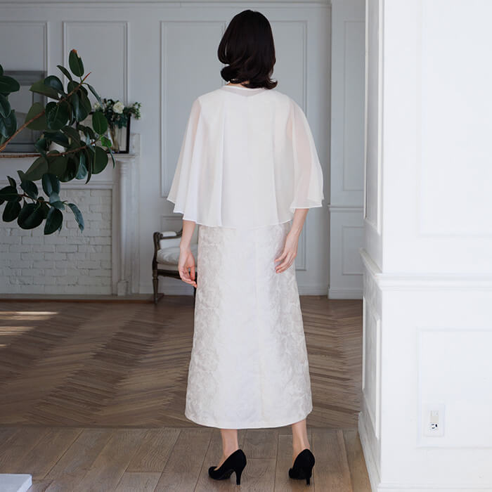 贅沢な花柄ジャカードワンピースとシフォンボレロを重ねた上品な装い。 シフォン素材のケープがナチュラルに肌をカバー。襟ぐりのブレードでアクセントを添えます。 後ろ下がりのデザインは、揺れ動きエレガントな印象に。 ミディ丈の長さのスカートが足長効果を与えバランスの良いスタイルを演出します。