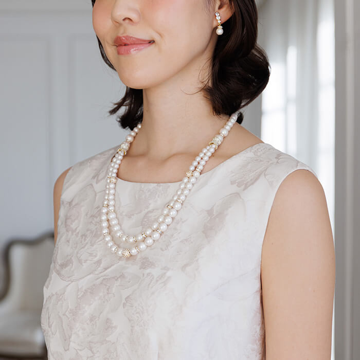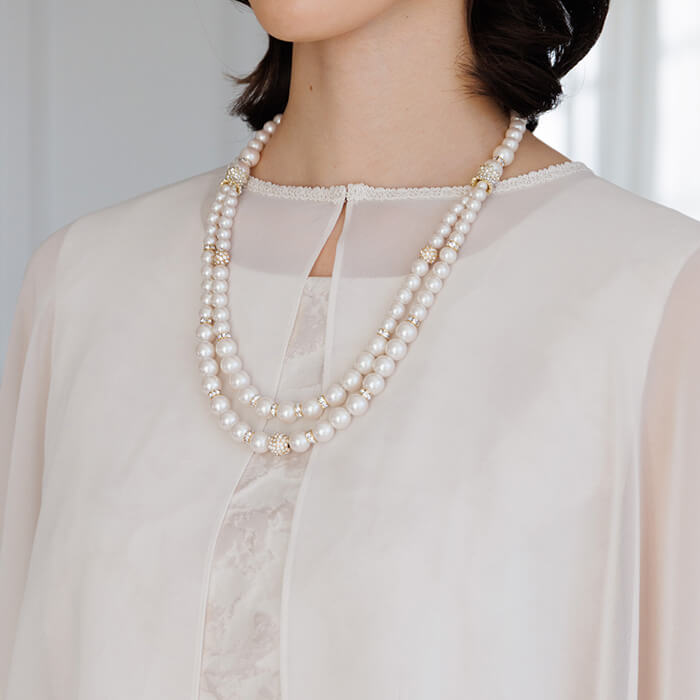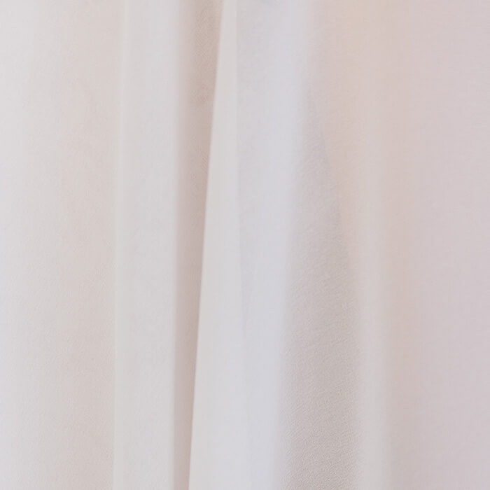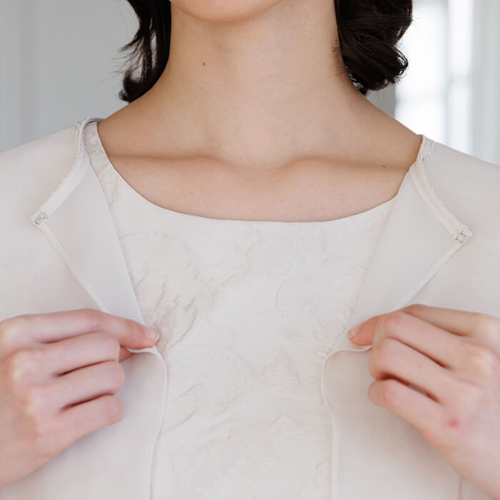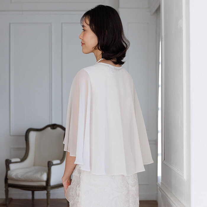 シフォン素材のケープがナチュラルに肌をカバー。後ろ下がりのデザインは、揺れ動きエレガントな印象に。