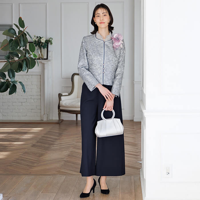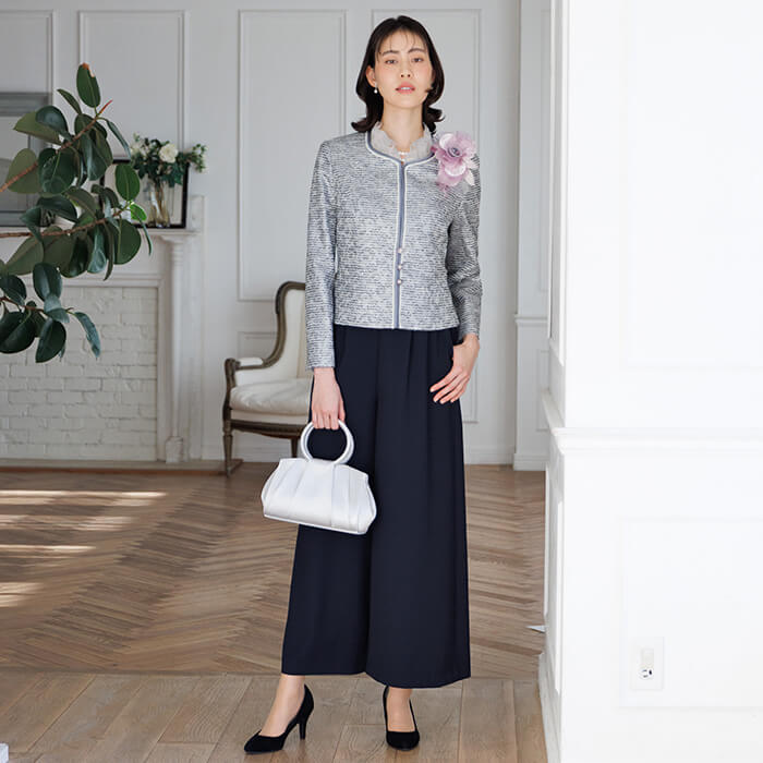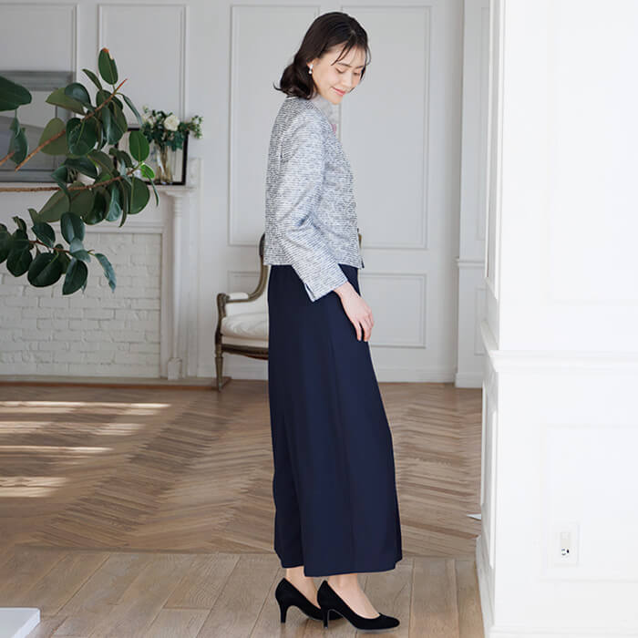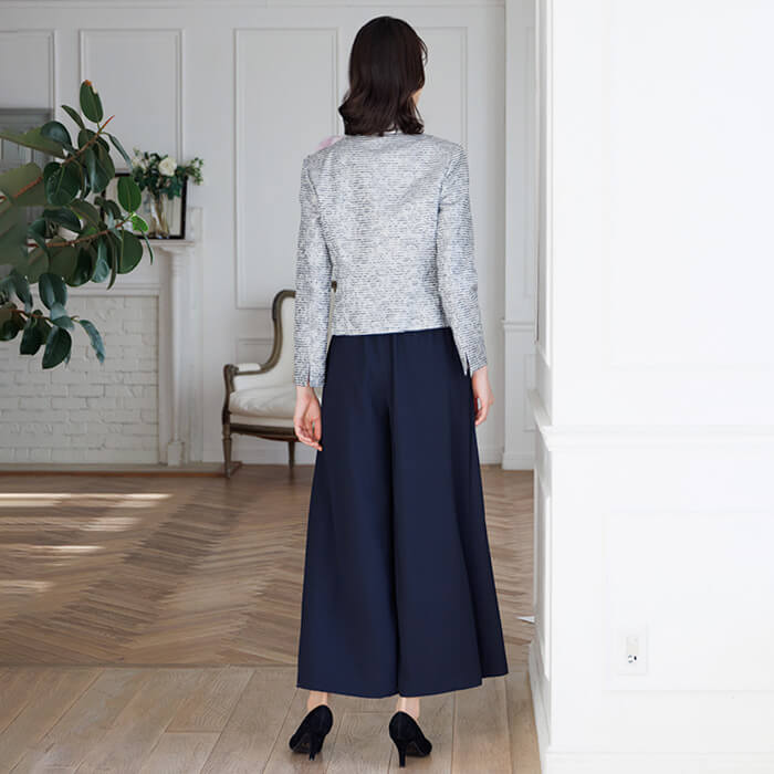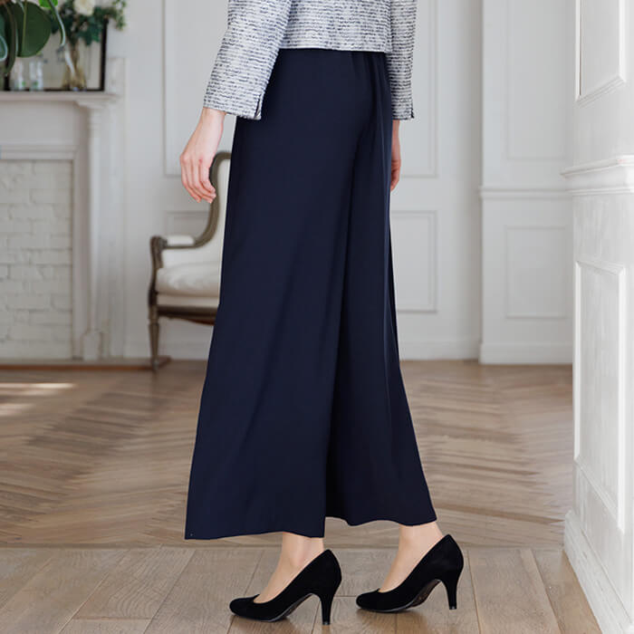 落ち感のある素材が縦ラインを強調し、脚長効果を発揮するワイドパンツ。ロングスカートのように見えるエレガントなシルエットはお祝いの席にぴったり。 上品な印象がフォーマル感を引き立て、様々なタイプのトップスと相性が良いです。